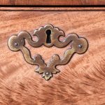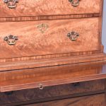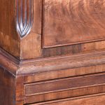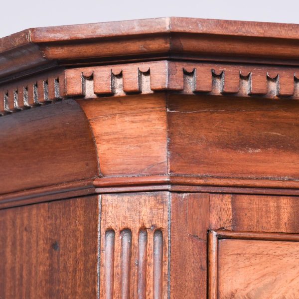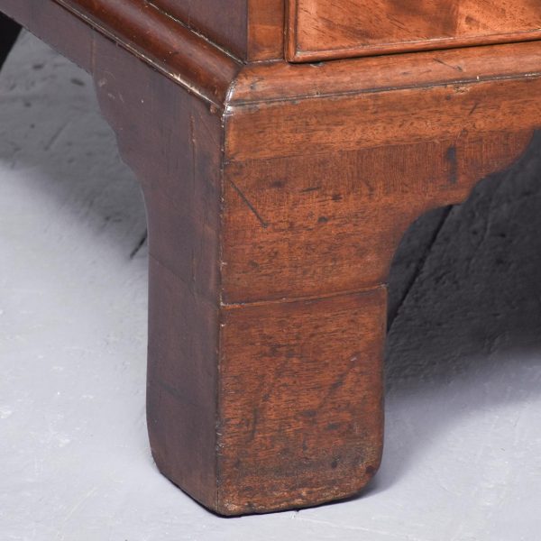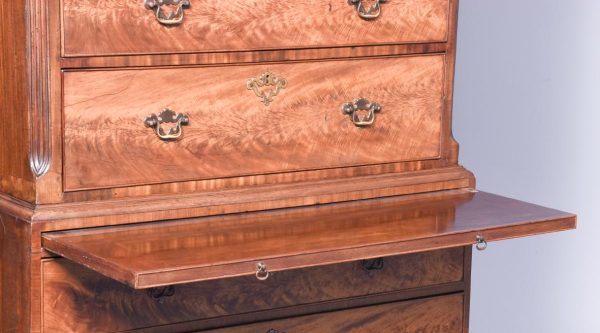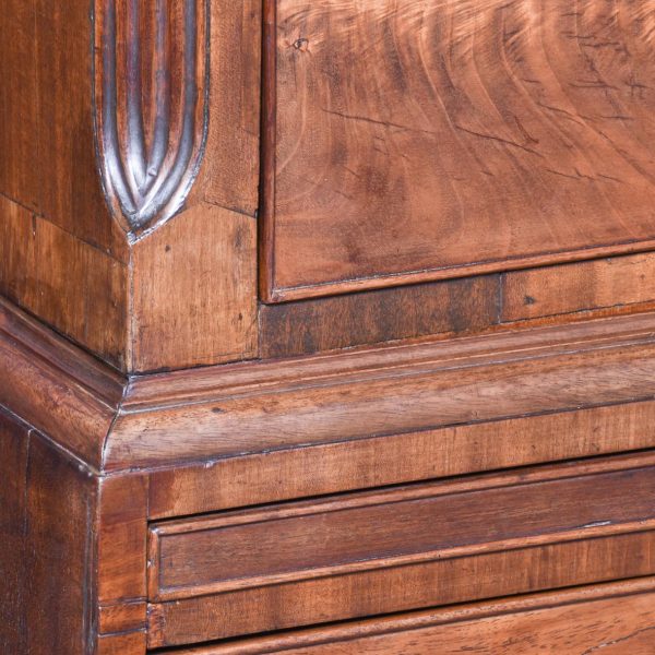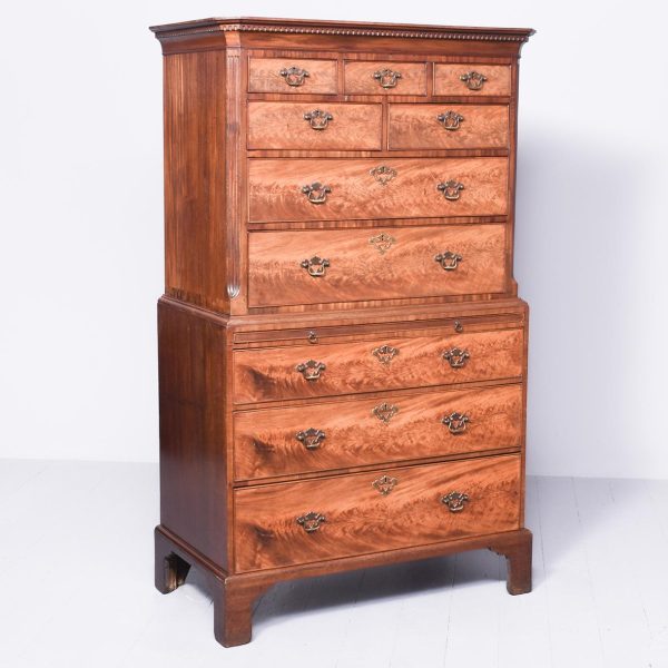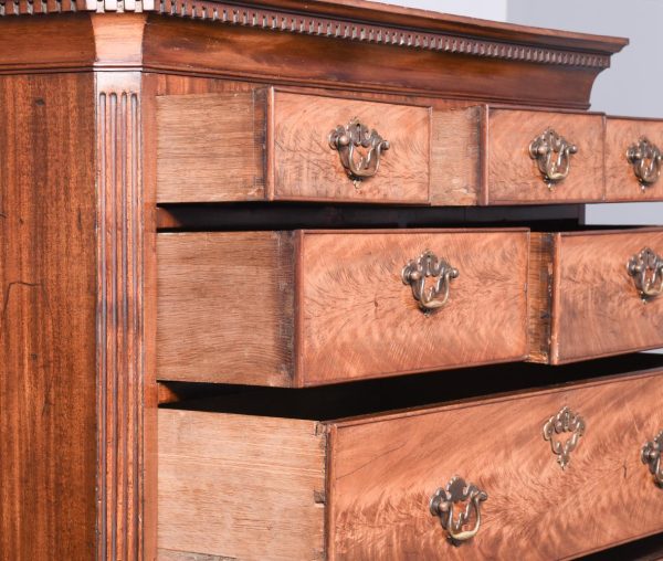 Circa 1770. Quality George III mahogany tall boy in excellent condition. Surmounted by a dentil cornice, the upper section with canted fluted sides and rare configuration of three short, over two short and two full length flame mahogany fronted drawers, with back to front, crosscut oak drawer liners and cut brass escutcheons and handles. The base with a brushing slide in figured mahogany above three conforming full-length drawers, over a neat moulded base with original bracket feet.