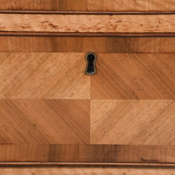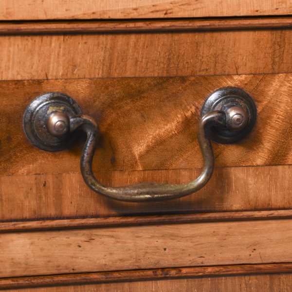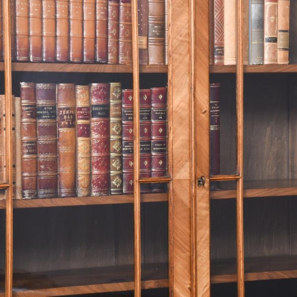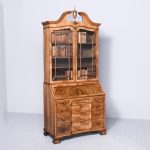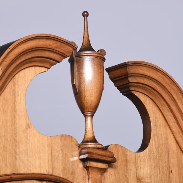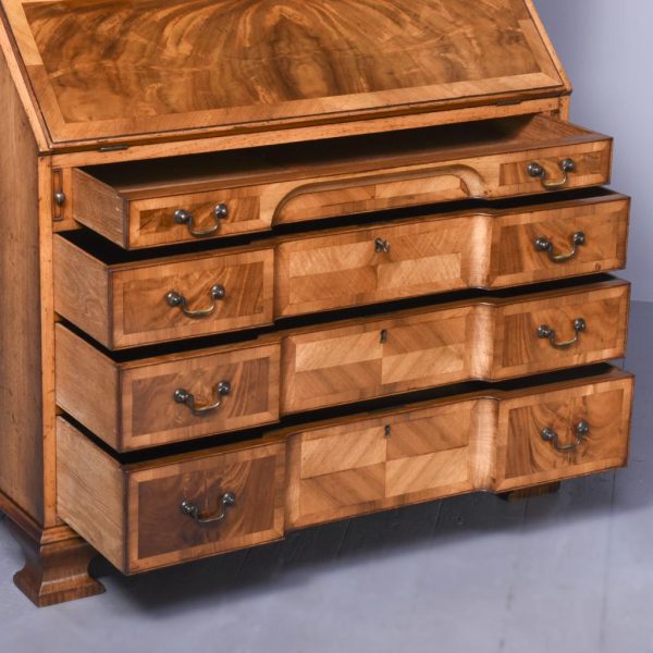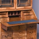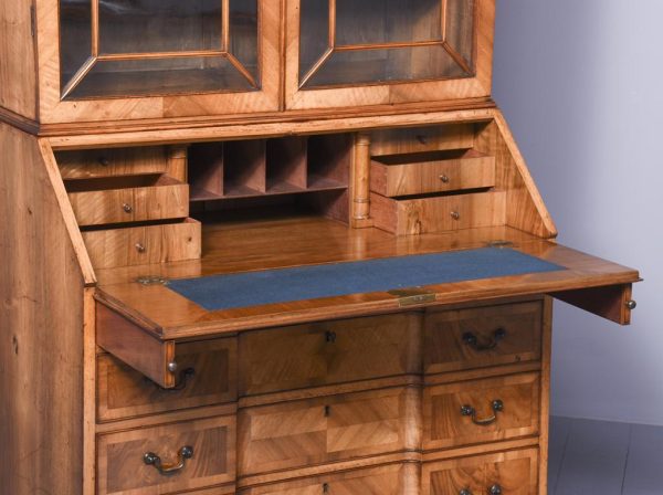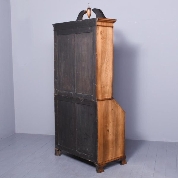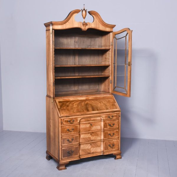 Circa 1900. George III style figured mahogany bureau bookcase. Surmounted by a broken arch cornice with tall urn and crossbanded frieze above two shaped astragal glazed doors, opening to shelved bookcase. The base with a crossbanded and mirror matched flame mahogany flap, opening to interior with secret compartments in neoclassical columns, pigeon holes, drawers and a baize writing surface above four block-fronted, crossbanded, cockbeaded, graduated drawers with swan neck brass handles and solid quarter-cut oak drawer linings above a shaped moulded base and ogee bracket feet. A quality item In perfect condition.