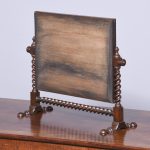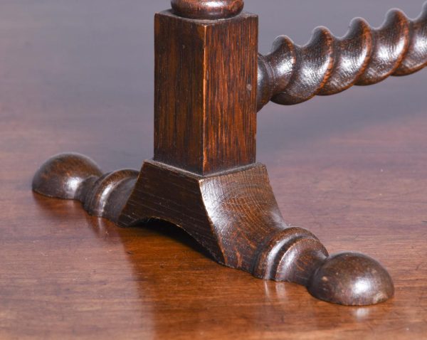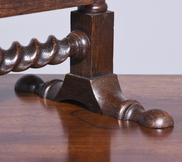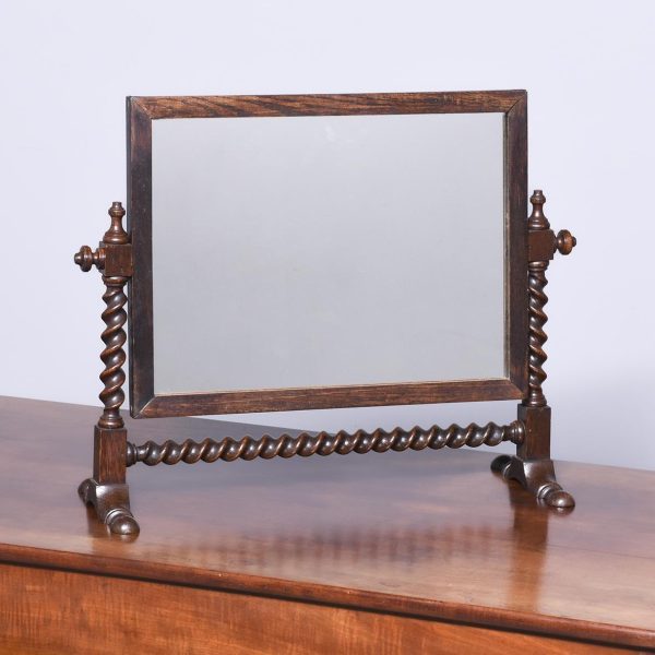 Circa 1900. Quality Jacobean revival barley-twist oak cottage-style dressing mirror. The rectangular mirror plate in perfect condition within a simple oak frame and supported on barley twist supports with turned finials, above a barley twist stretcher and supported on neat split turned plinths.