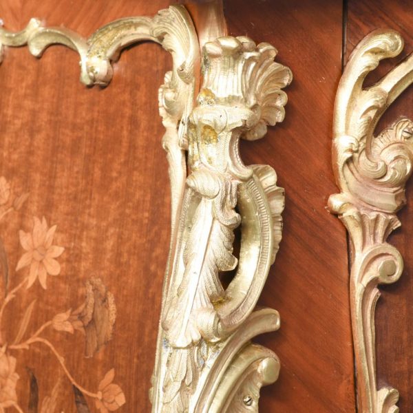 Circa 1960. Quality Louis XIV style marquetry inlaid mahogany marble top French commode. The variegated grey, green and cream coloured marble top with a moulded serpentine front over two deep drawers with exceptional rococo ormolu mounts, escutcheons and handles. The drawers outlined with rococo ormolu scrolls over a shaped apron with ormolu cartouche. The sides with ormolu mounted panels of marquetry flowers and supported on angular cabriole legs with ormolu capitals and ball and claw ormolu sabots.