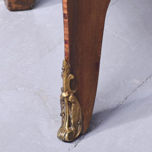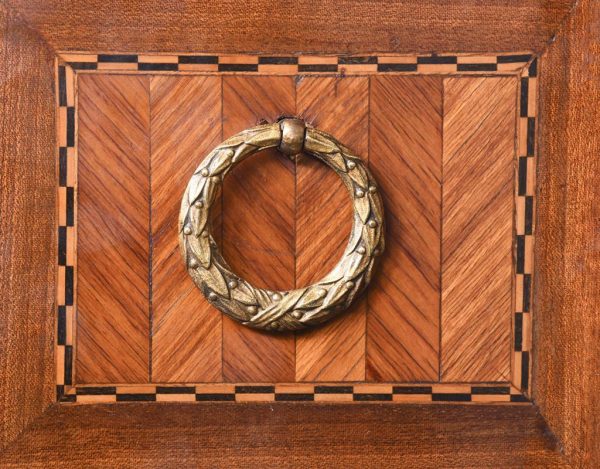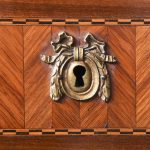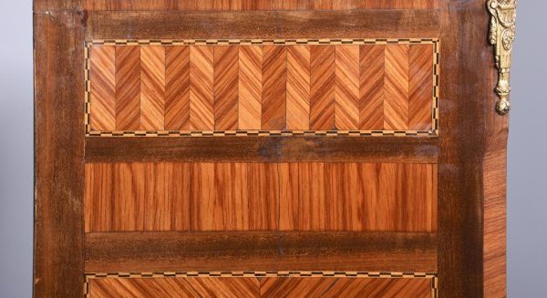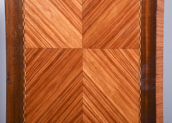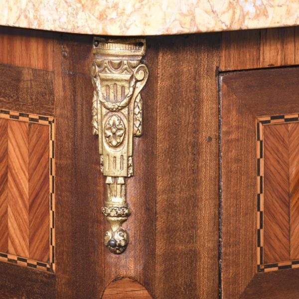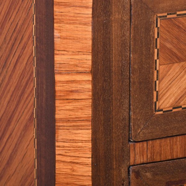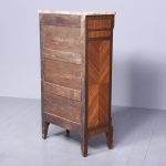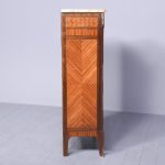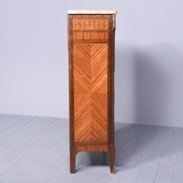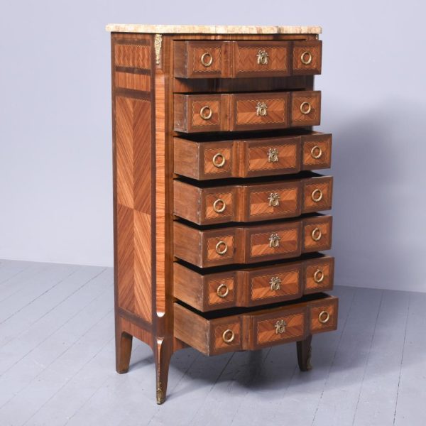 Circa 1880. Quality Louis XVI style marble top, tall French kingwood chest of drawers. The serpentine front variegated cream marble top above 7 shaped-front drawers with neoclassical circular drop ormolu handles and escutcheons. The drawers with solid oak liners have panels of herringbone- pattern kingwood inlay surrounded by chequered satinwood and ebony inlay. The chest with canted and crossbanded corners with ormolu mounts. The sides with matching herringbone-style inlay and large quarter-cut kingwood panels. All supported on chamfered, tapering legs with ormolu sabots. In pristine condition.