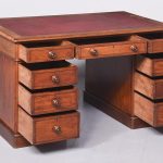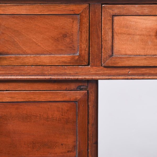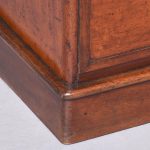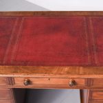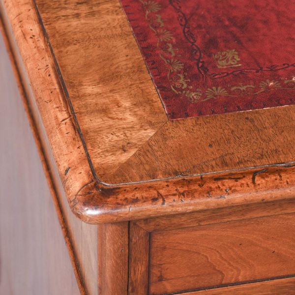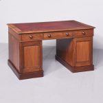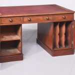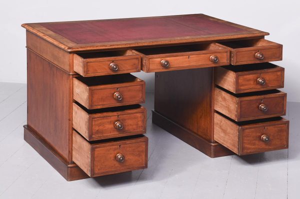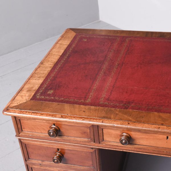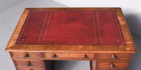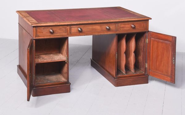 Circa 1850 Quality mahogany smaller sized Victorian Partners desk. The cross-branded rectangular top with a burgundy red writing surface. The front with three frieze drawers with flame mahogany front and original turn-knobs and solid mahogany linings (a sign of quality). Supported on plinths with three matching drawers to the front and folio cupboards to the rear. Lovely colour and patina.