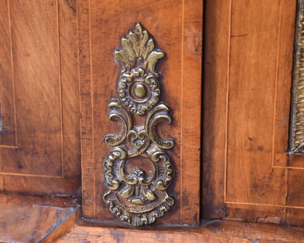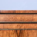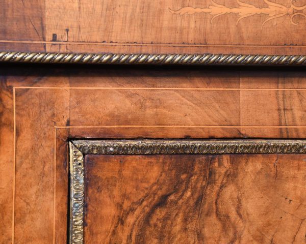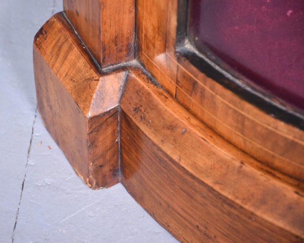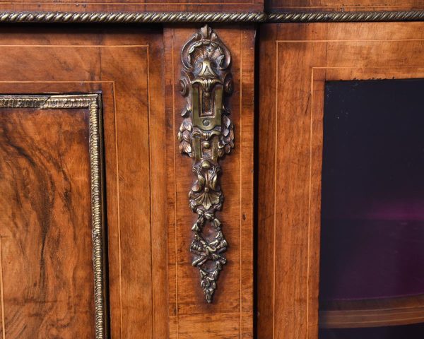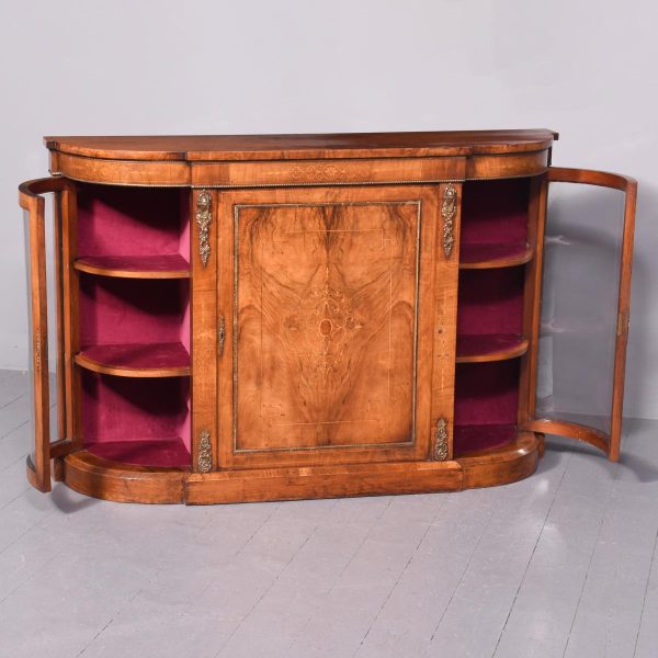 Circa 1860 Quality mid-Victorian inlaid walnut bow-end Credenza. The polished top in mirror-matched figured walnut with a lovely mellow colour, over a boxwood inlaid marquetry inlaid frieze with cast brass banding beneath. The sides with glazed bow-front cupboards, opening to shelved interiors and centrally, a marquetry inlaid door opening to shelved cupboard.