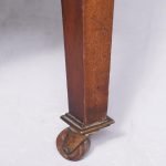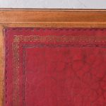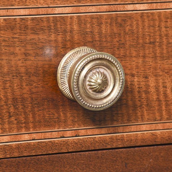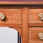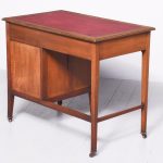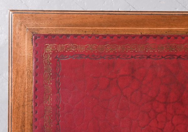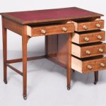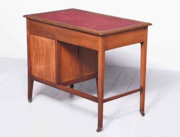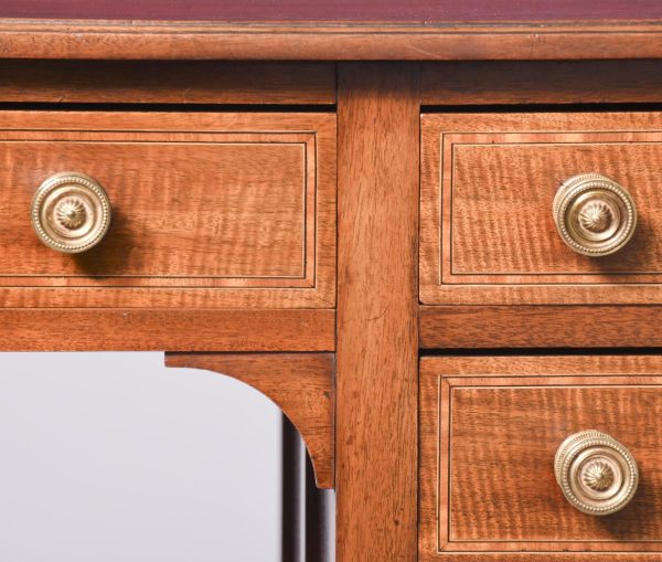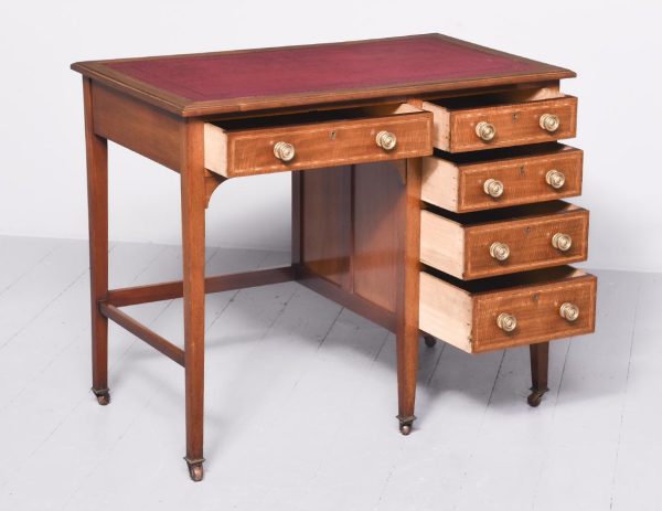 Circa 1900. Quality neat-sized Edwardian Sheraton style writing desk. The rectangular top with a burgundy gilt-tooled leather writing surface and boxwood inlay. With a single ash-lined (sign of quality) drawer on the left hand side with original brass handles and boxwood, ebony and tulipwood inlay and a bank of four matching drawers on the right side, all supported on square tapering legs with brass and brown porcelain castors.