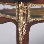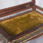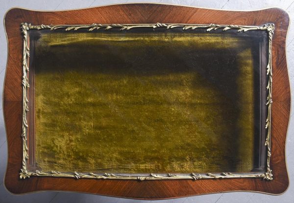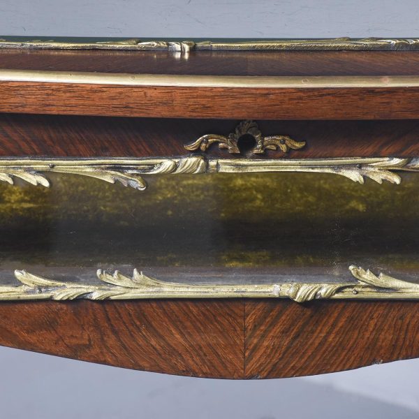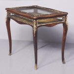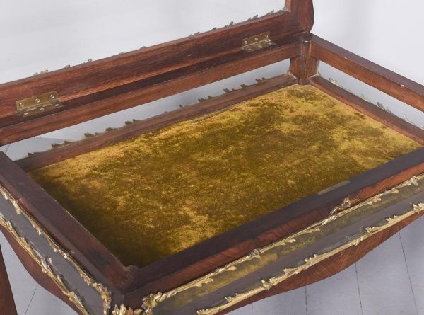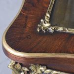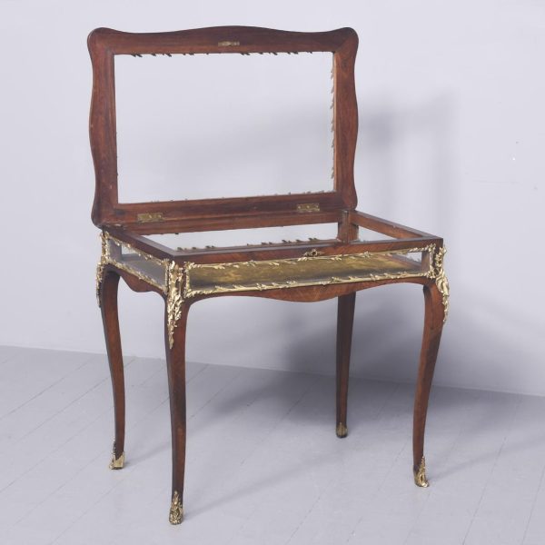 Circa 1860. Quality ormolu (gilded bronze) mounted Victorian large-size rosewood bijouterie table. The shaped rectangular top with brass banding and serpentine sides with elaborate ormolu (gilded bronze) foliate decoration around the beveled edge glass surface. All the sides with glass panels with matching ormolu mounts and all supported on cabriole legs with ormolu mounts and sabots