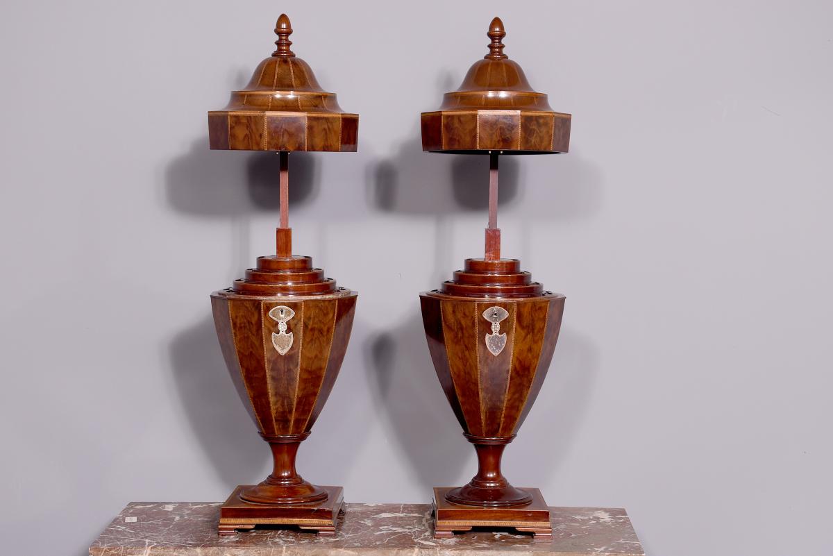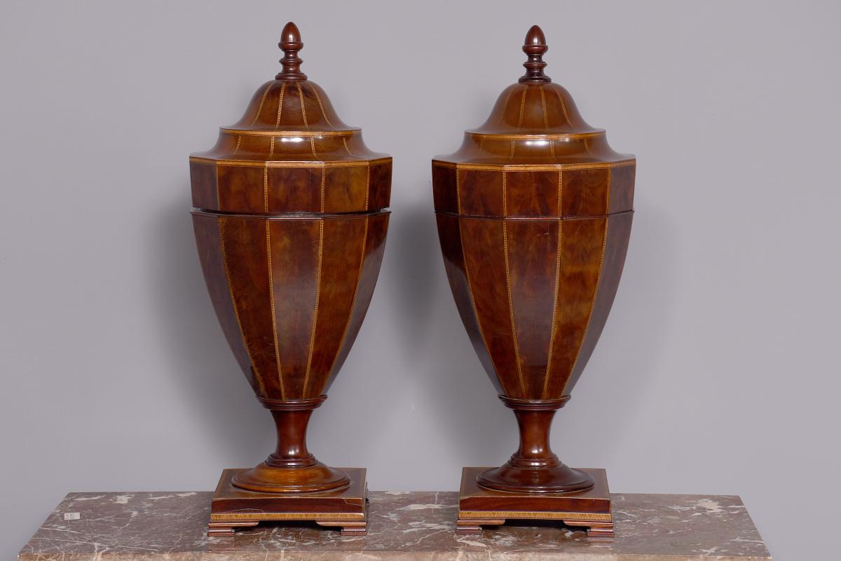 Circa 1890.A pair of George III style mahogany and inlaid and sliver mounted urn shaped cutlery stands, each surmounted by a stylish finial, the lids with chequered chevron inlay with curvaceous concave sections, the deep shaped lid with a central upright on the inside, open to a stepped and fitted interior with four tiers, fitted out for different shapes of cutlery, the front with a double escutcheon, in white metal or silver, the tapering body with similar inlay as the top, with a large circular foot resting on a square inlayed platform base, all supported on four squat ogee bracket feet. Fantastic colour and patination and great style.