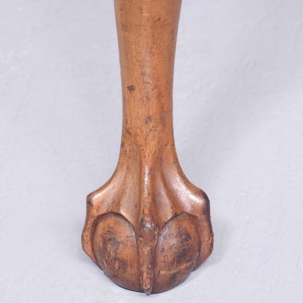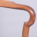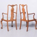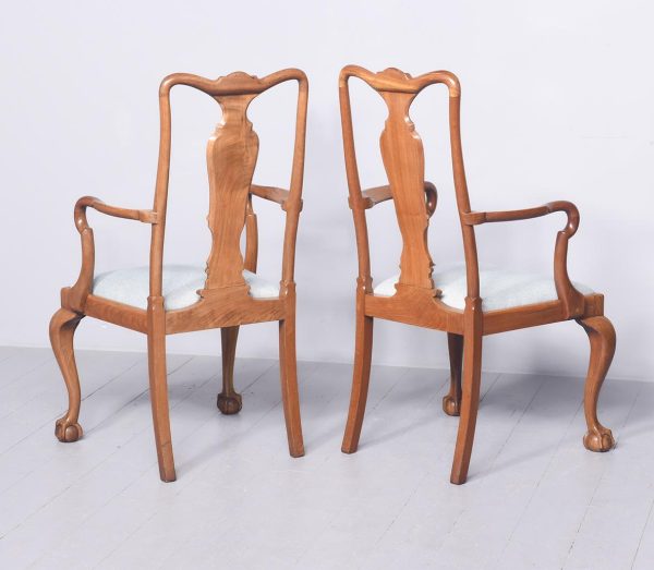 Circa 1900 a quality pair of mahogany Queen Anne style arm chairs with a shaped cresting rail and elegant Queen Anne style splat, two well-formed arms held in place by shaped supports, large drop in seat pad simple seat rails, with square sno swept back legs, front legs cabriole legs with quarter blocks finishing on ball and claw foot. Both chairs have great colour and patination.