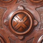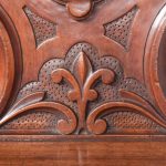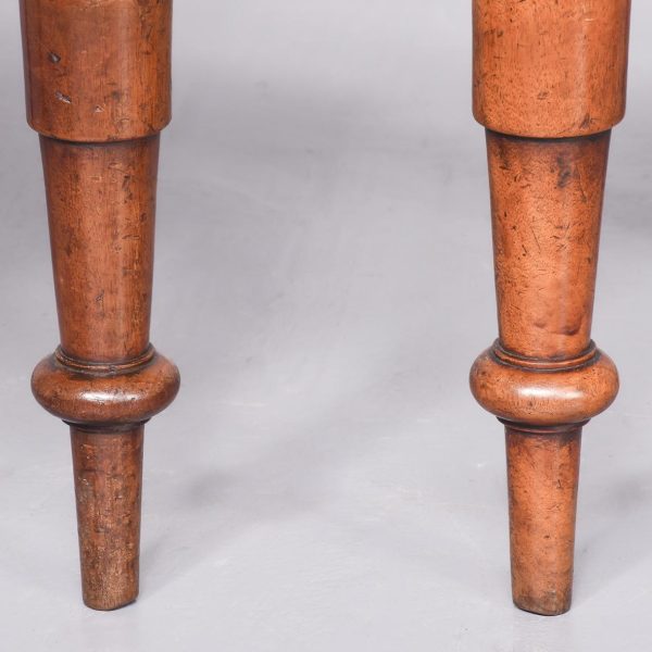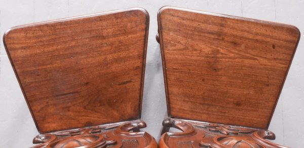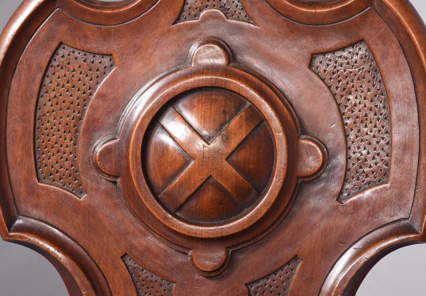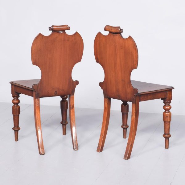Circa 1870 Quality Pair of Victorian Mahogany shield back hall chairs. The shield shaped backs with scrolled tops and central roundel and fleur des lis and roundel decorations, above the solid mahogany seats with simple seat rails. Supported on ring-turned legs in front and outswept rear supports