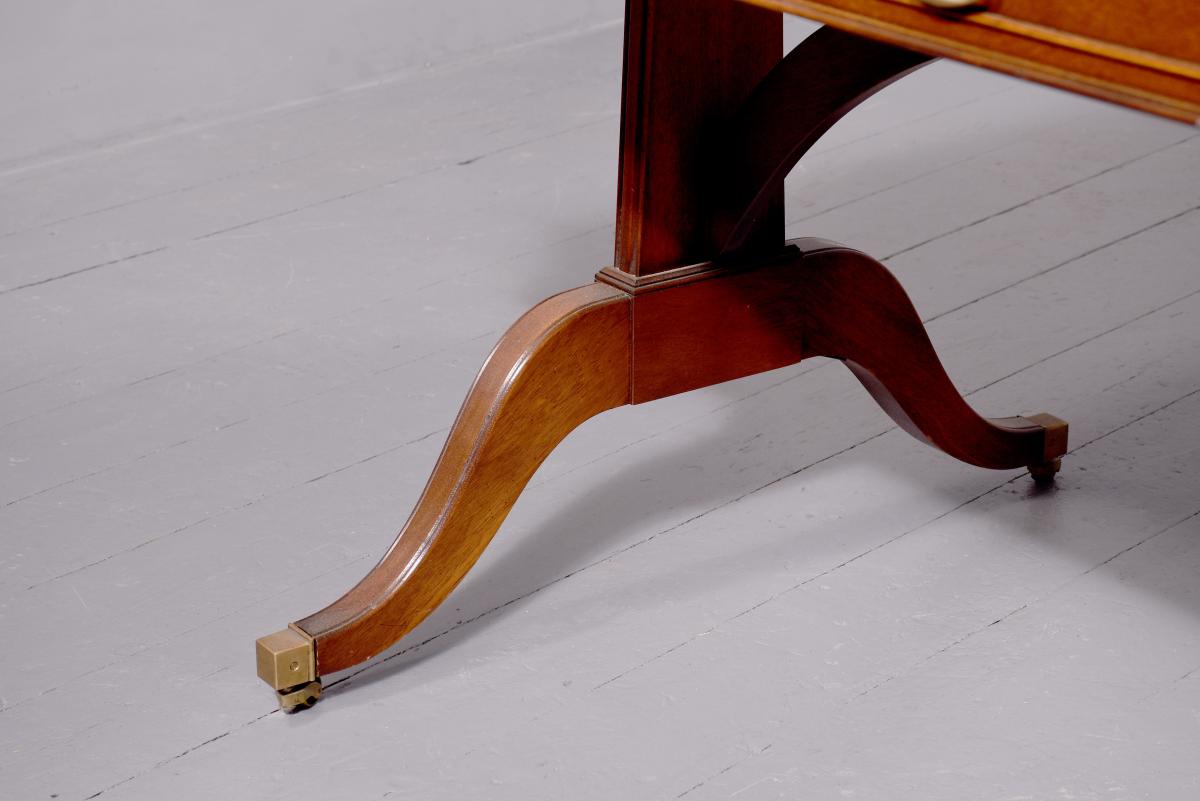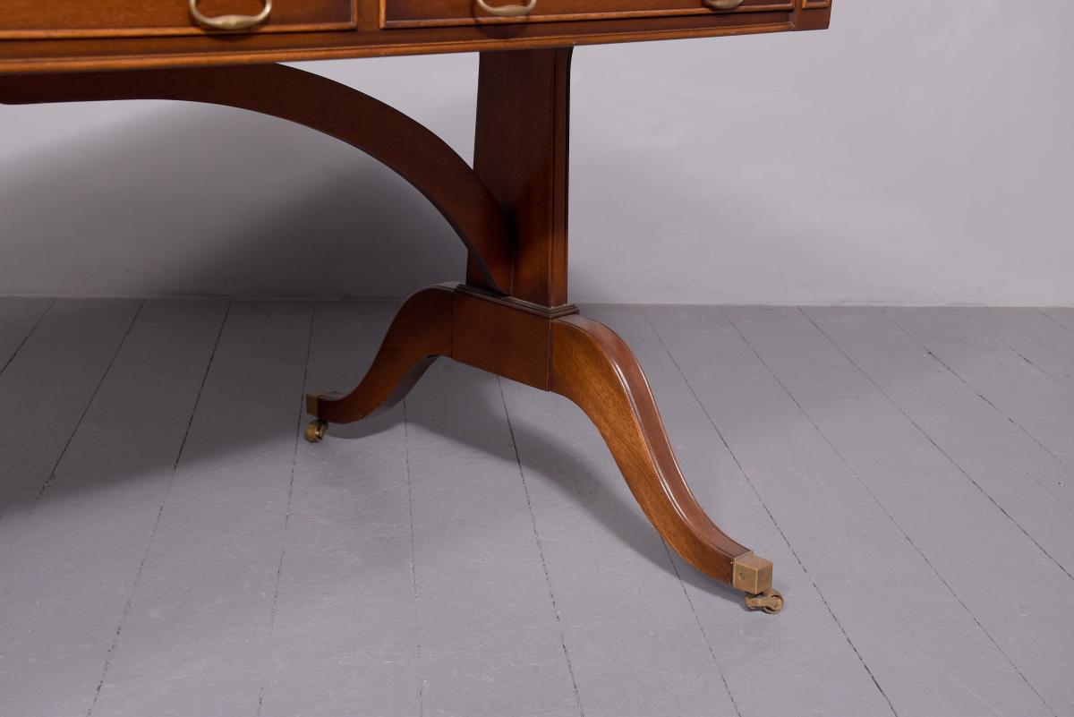 Circa 2000. Quality Regency-Style Mahogany Partners Writing Table. The writing surface with three panels of green leather with gilt tooling and a moulded edge over three frieze drawers with brass swan-neck handles and matching dummy drawers on the opposite side. Supported on trestles over twin cabriole legs with brass caps and casters.