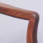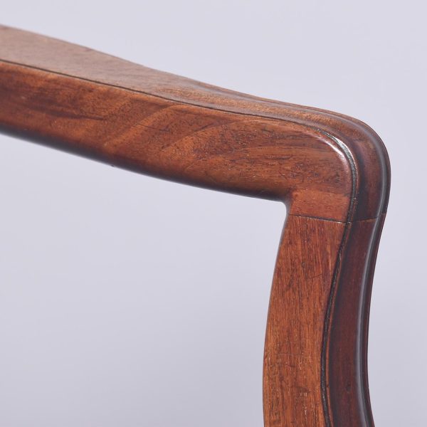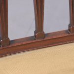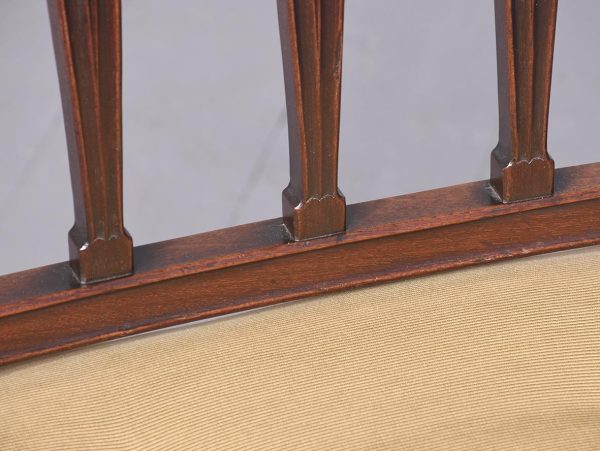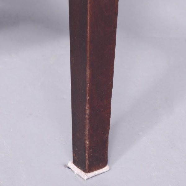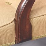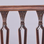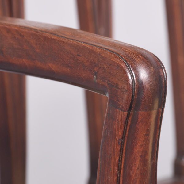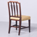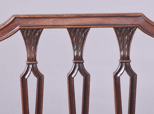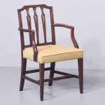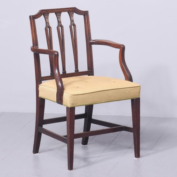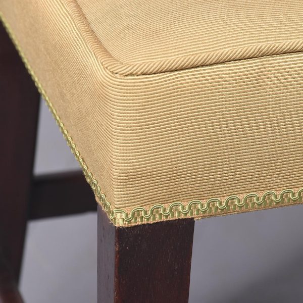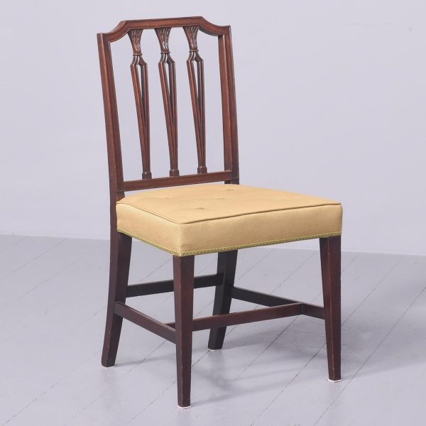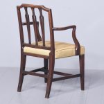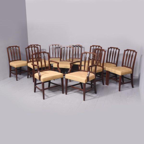 Circa 1790. Quality set of 12 mahogany dining chairs, with a shaped beaded top rail, back with three pierced uprights capped with carved acanthus leaves. The curved and shaped arms supported on elegant uprights, the large stuff over seat with a piped fore-edge and five fabric buttons giving the impression of been a squab cushion. Back legs are square and slightly out swept the front legs are square and tapering, braced by H shaped stretchers to the underside, back legs braced also. Set consisting on 10 side and 2 armchairs.