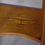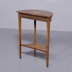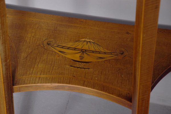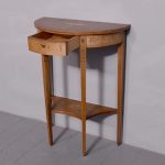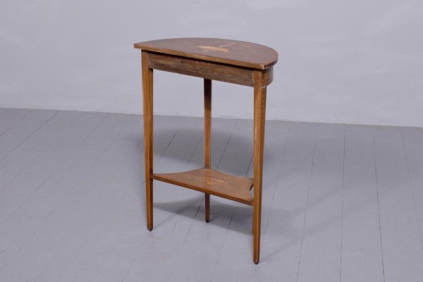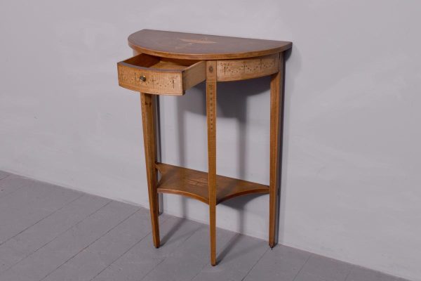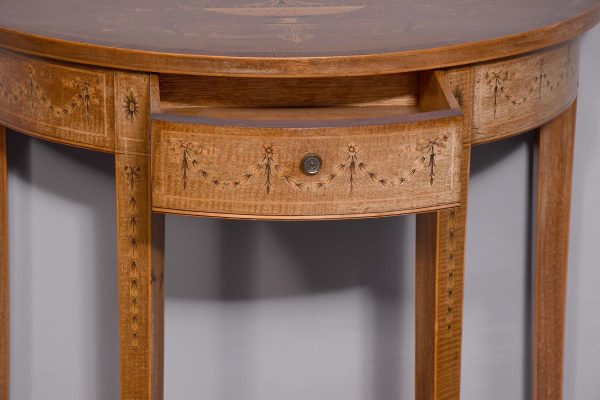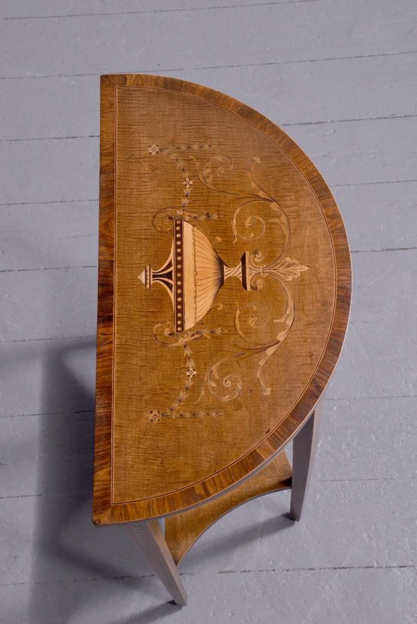 Circa 1900. A diminutive Sheraton style mahogany and profusely inlaid demi-lune side table, the well decorated top with large classical urn with swags and tails made with several exotic timbers, with ebony and string inlay and rosewood banding, framed with boxwood, the frieze with inlays of swags and tails with a small drawer in the centre with a stylish cast brass knob handle, resting on four square tapering inlaid legs with harebells on the facings and a small shelf towards the base with an urn inlay with a concave front and sides, finishing on brass feet.