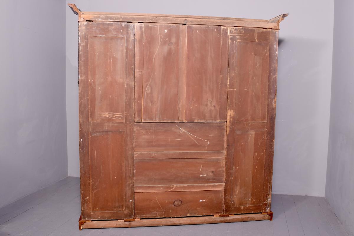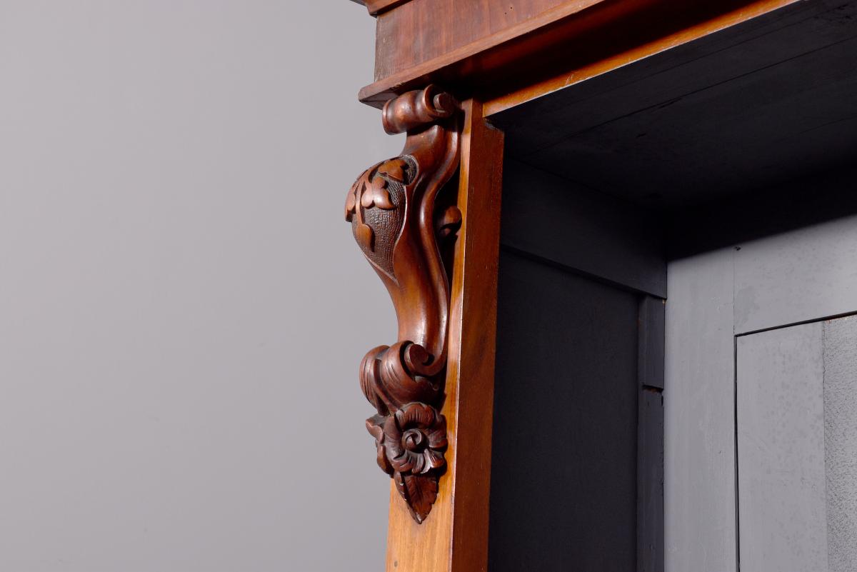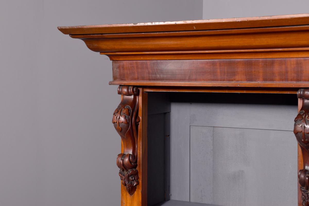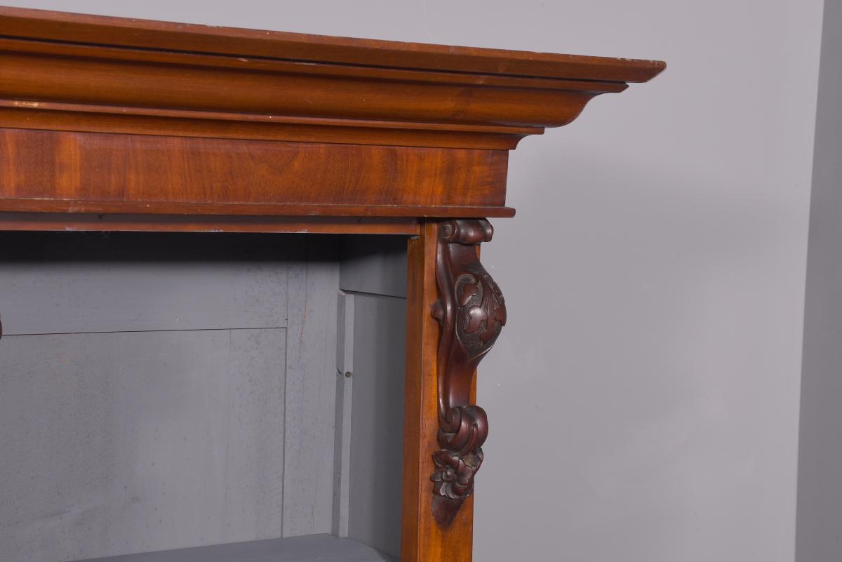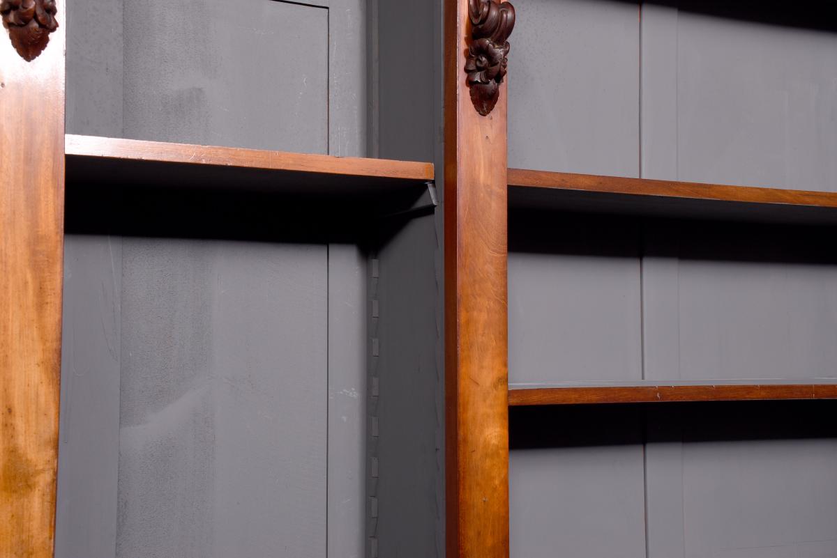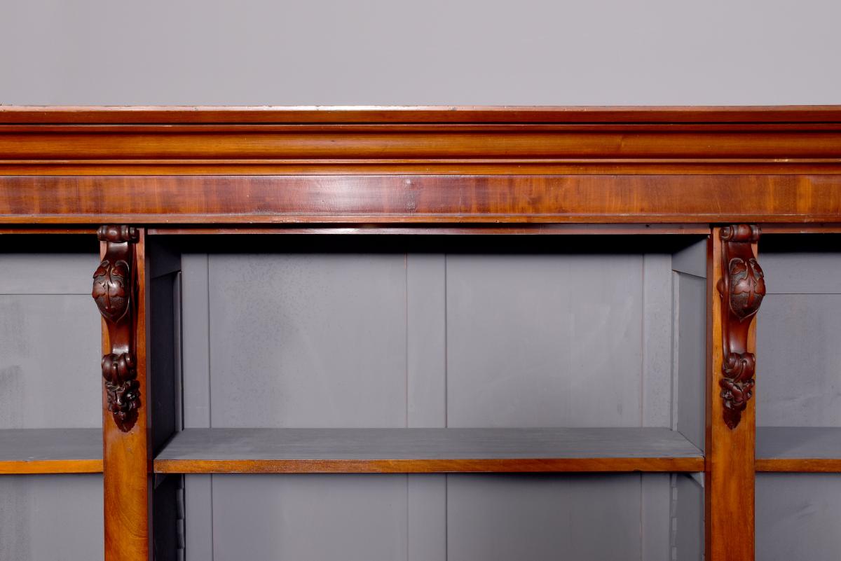 Circa 1860 with adaptations. Quality three-section, mid-Victorian mahogany open bookcase. Surmounted by a molded cornice above a simple cross-banded frieze, the three bookcase sections (wider middle section) and the sides are separated and flanked by figured mahogany pilasters with carved corbels on top and each containing five adjustable shelves. The sides in a beautiful mellow figured mahogany and sitting on a molded and enclosed plinth base. Attractive and functional.