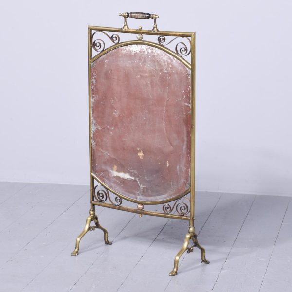 Circa 1870. Quality Victorian brass and mirrored fire screen. Surmounted by a fluted ebonized and brass handle, the rounded frame with scrolled copper decorations, above an oval bevelled mirror, with mirror plate in perfect condition with engraved sunburst more centrally. The base with further scrolled copper decoration. All supported on twin cabriole feet. In perfect condition.