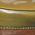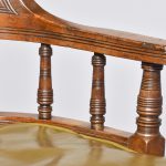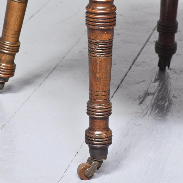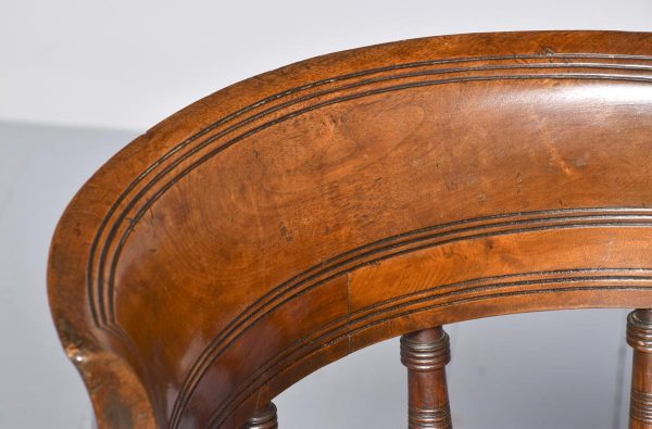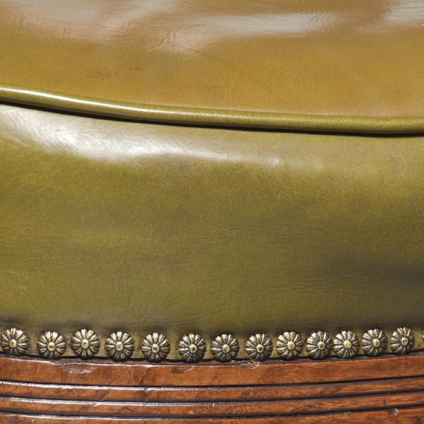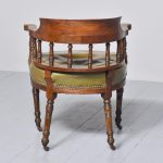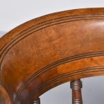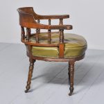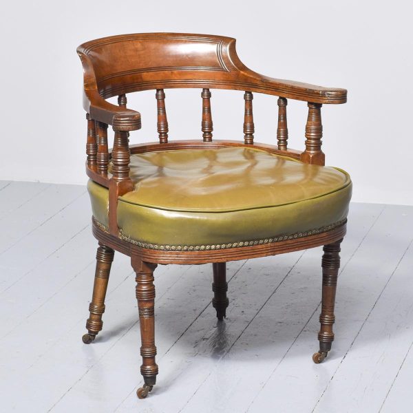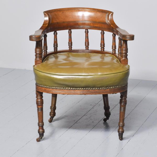 Circa 1890. Fine quality, Victorian mahogany desk chair of unusual design. The horseshoe shaped back and slightly outset arms with a curved and fluted top rail supported on turned spindles above a generous green hide upholstered seat with brass studding and piping. Supported on ring turned legs with brass and brown porcelain casters. Beautiful colour and patina.