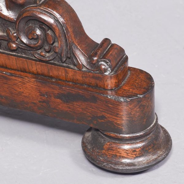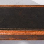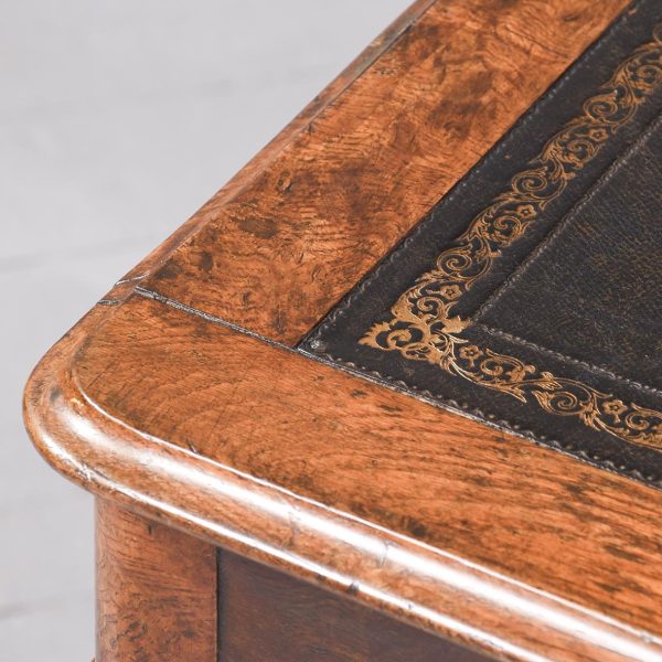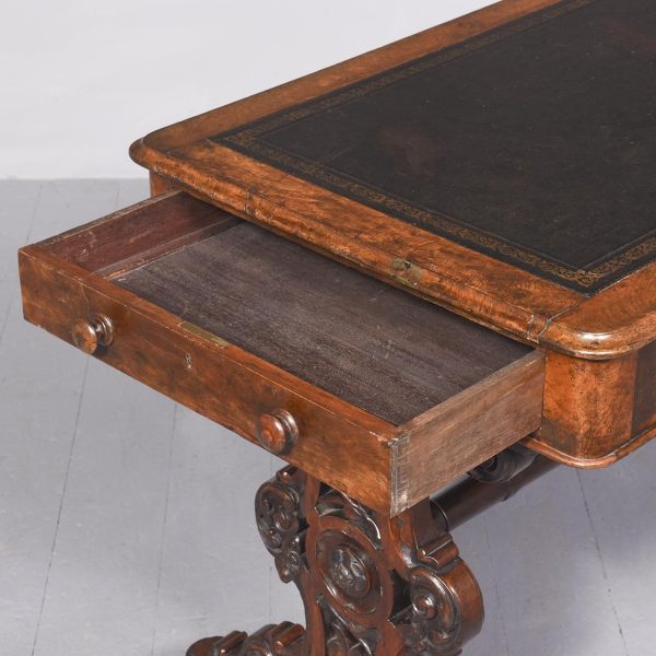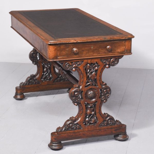 Circa 1830 Quality William IV pollard oak freestanding library/writing table. The rectangular top with a dark green tooled leather writing surface and a pollard oak surrounds, with frieze drawers with twin bun handles on both ends and supported by magnificent open trestles with carved flowers and acanthus leaves over platforms with turned cup feet with hidden brass castors, lovely colour and patina.