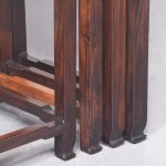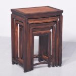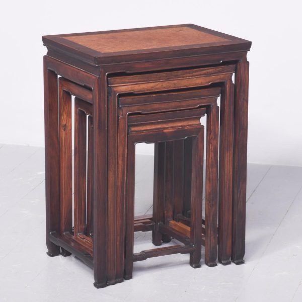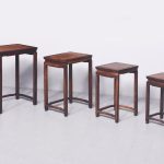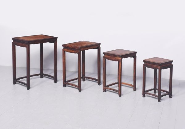 Circa 1900. A quartetto of Qing Dynasty huanghuali and root wood occasional tables. The tops with insert burr wood, contained in a broad huanghuali frame, with a shaped beaded frame, resting on classic Chinese legs with beading on one side, the legs braced by shaped stretchers finishing on a simple toe. The tables nestle comfortably into each other.
