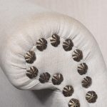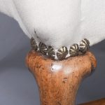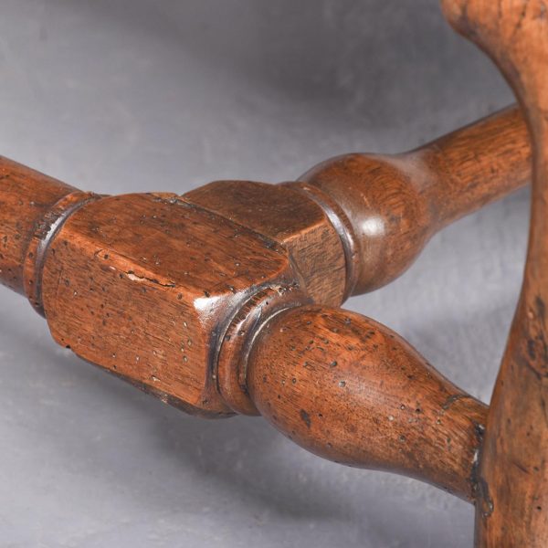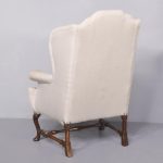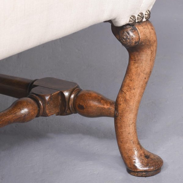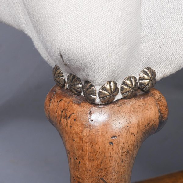 Circa 1710. A rare walnut framed Queen Anne wing chair, with shaped top, curved wings, stuff over upholstered arms and seats, the facings with elegant brass studs, the back legs, turned with a square out swept foot, front with elegant cabriole legs with rondels at the corner of the quarter blocks, finishing on an elegant pad foot, legs are braced by ring turned and tapering stretchers.