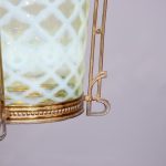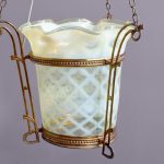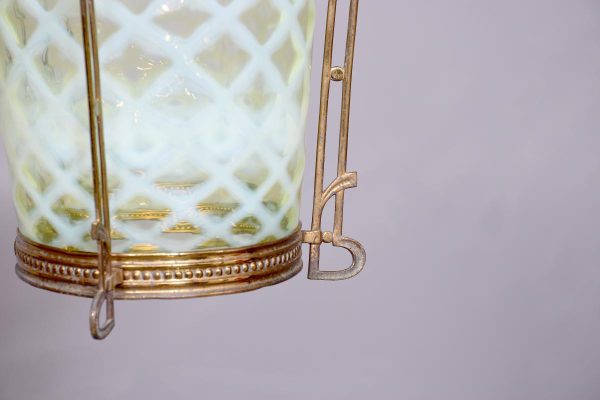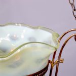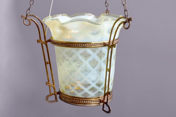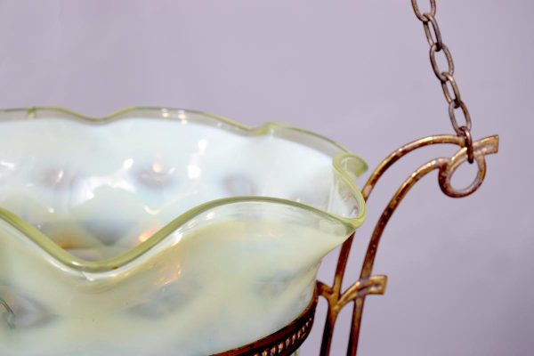 Circa 1890. Rare Art Nouveau Vaseline Glass and Brass Circular Light Fitting. The shaped and colored Vaseline glass with a crenated top supported in an Art Nouveau style brass frame and suspended on three brass chains. In perfect condition.