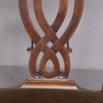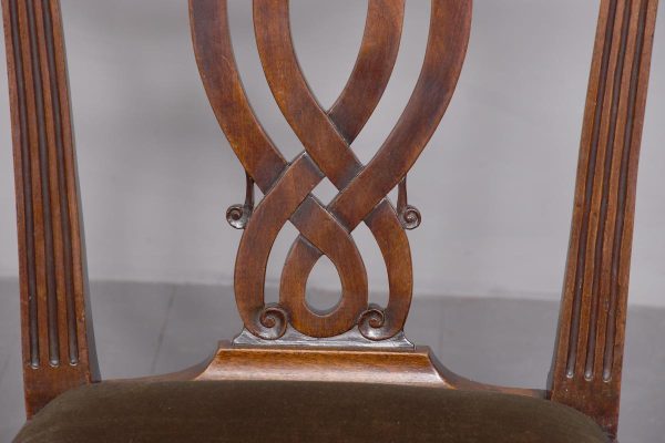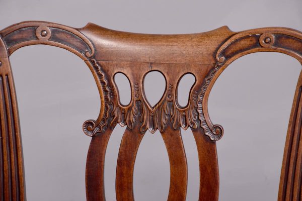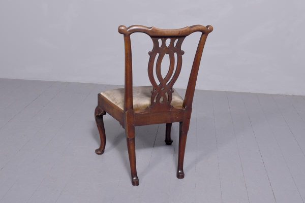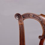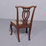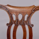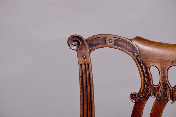 Circa 1830. A rare early Scottish mahogany hand chair, the raised and shaped top rail with rondels on the facings, a carved and pierced curvaceous splat, ribbed uprights with finely carved edges, with a drop in seat with rounded corners and a simple rail with visible peg dowels, the back legs slightly out swept finishing on a pad foot and cabriole front legs with solid quarter blocks finishing on a generous pad foot.