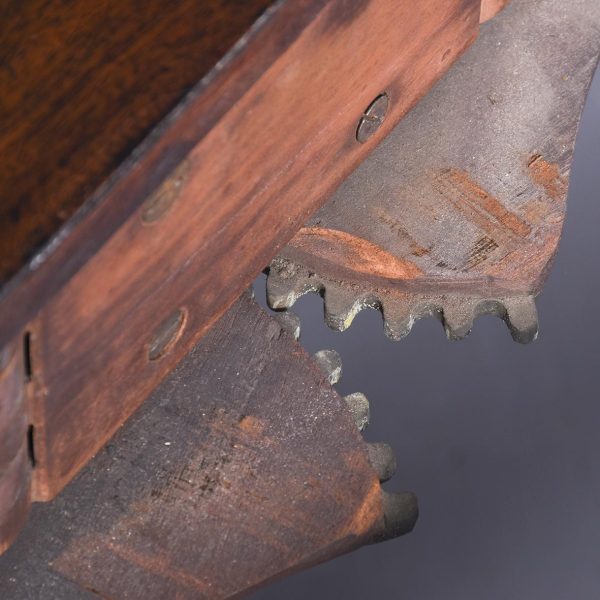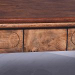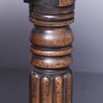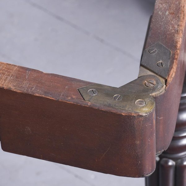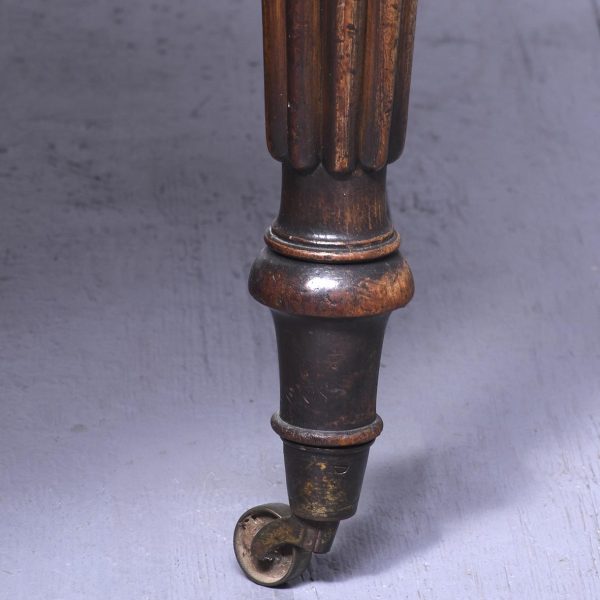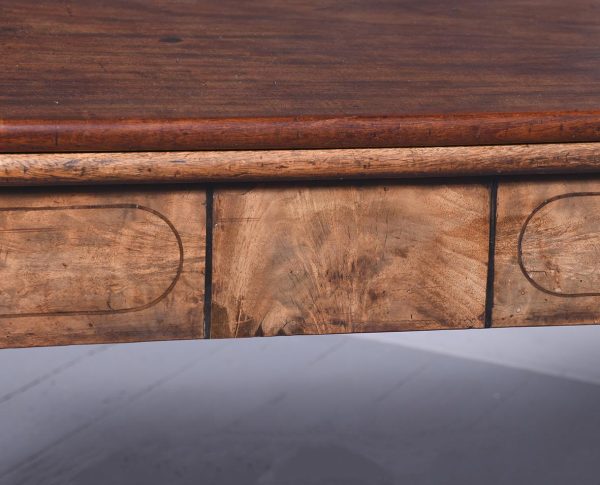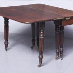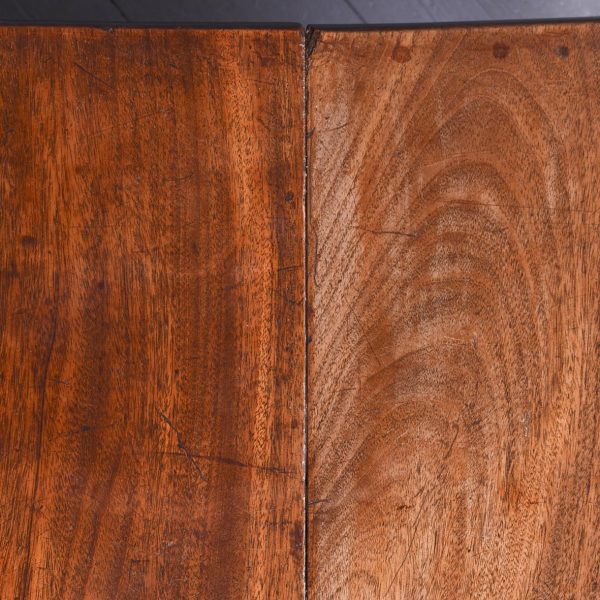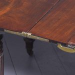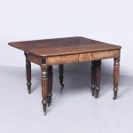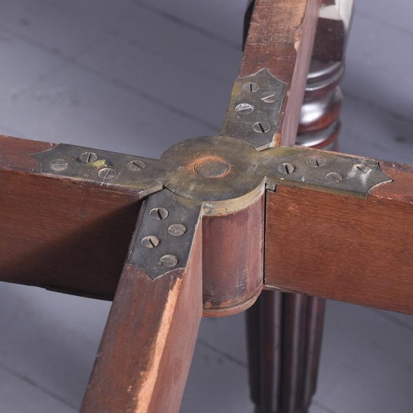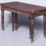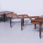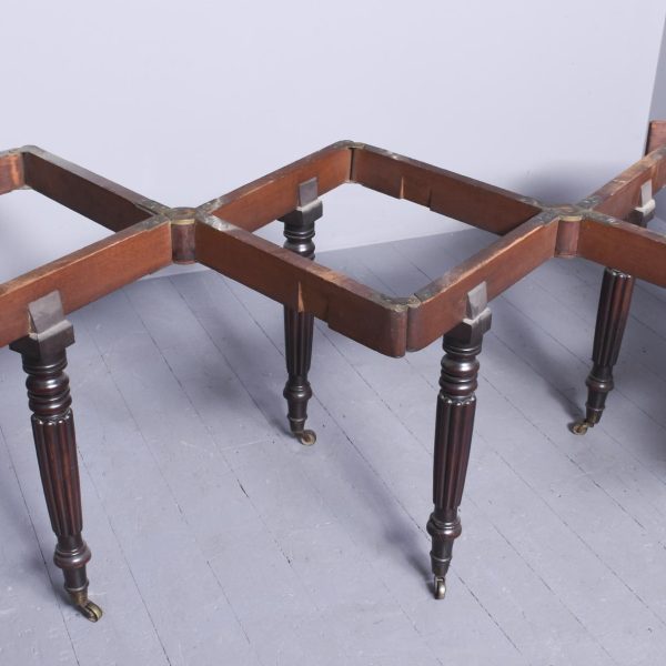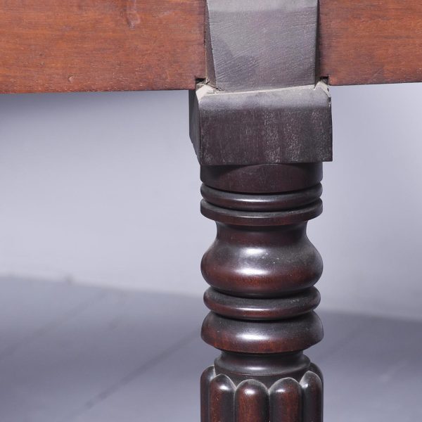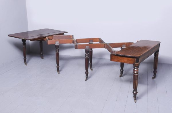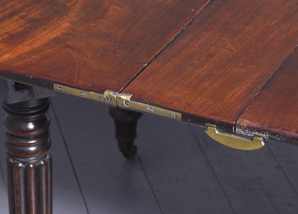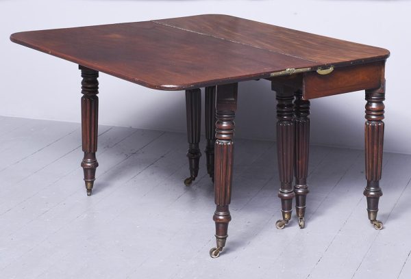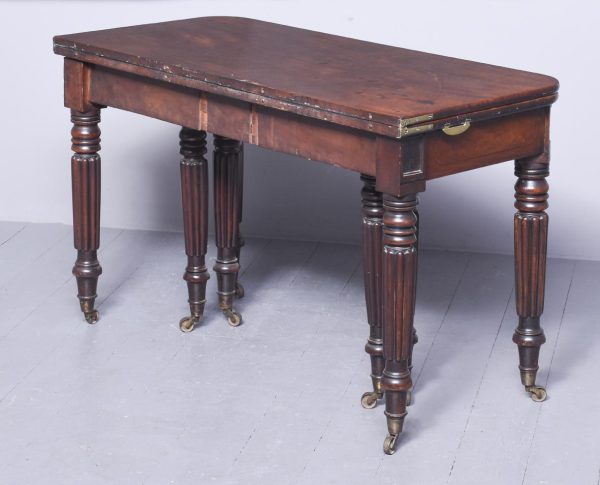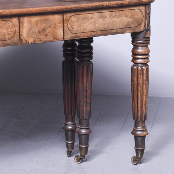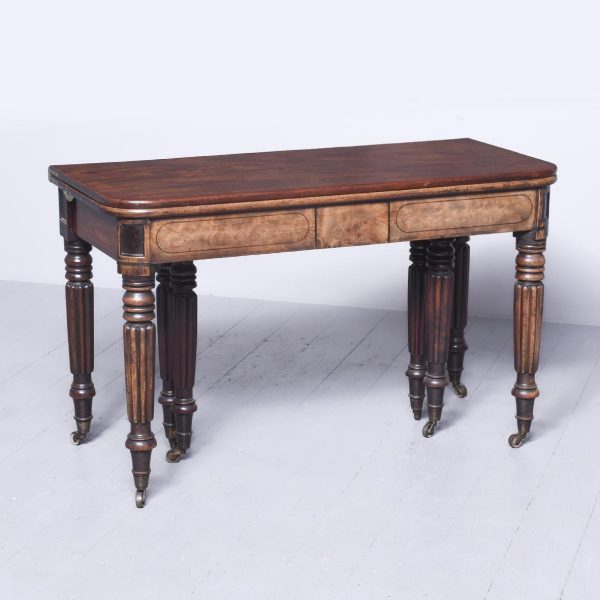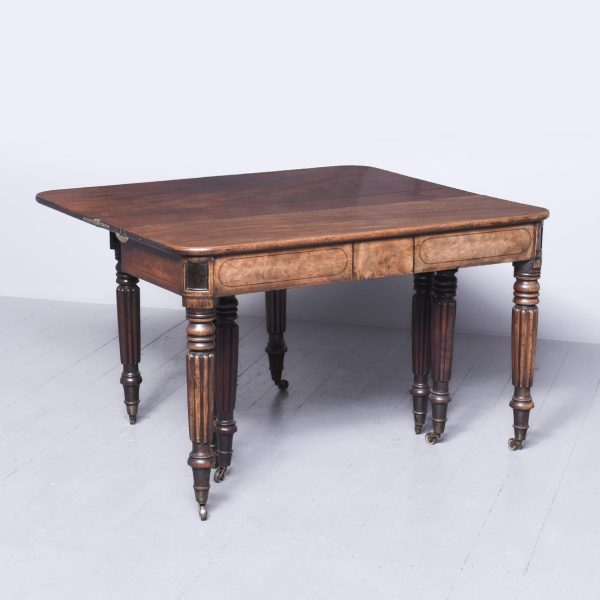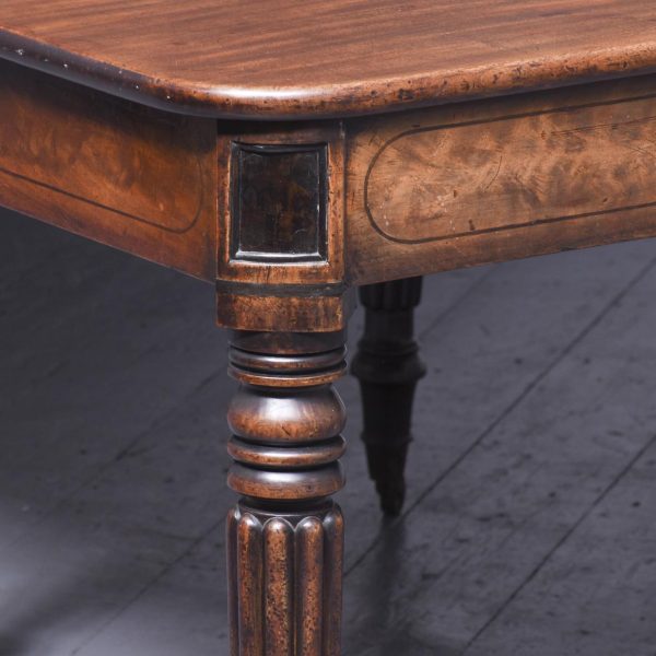 Circa 1820. A quality patent action George IV mahogany fold over telescopic dining table. In the closed position the table looks like an outsized tea table, the rectangular top with rounded corners in fine flamed mahogany. The top is hinged and when opened has a polished interior, the undercarriage has two scissor actions (wood & metal). The table opens on eight turned and fluted legs and takes three extra leaves, the front of the table is a deep frieze with flame mahogany with ebony inlay panels with oval panels on the front and sides.