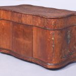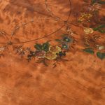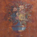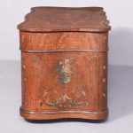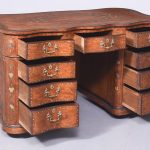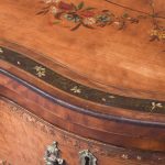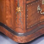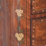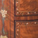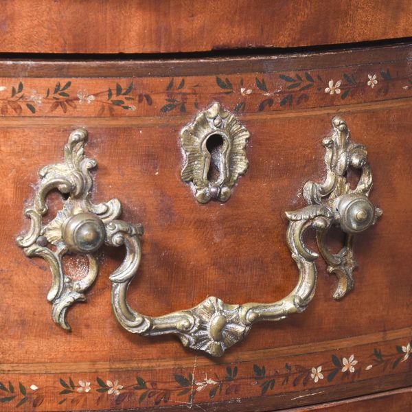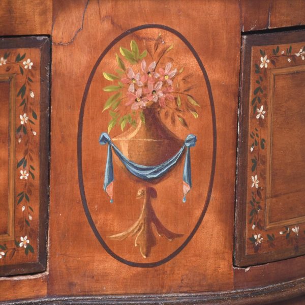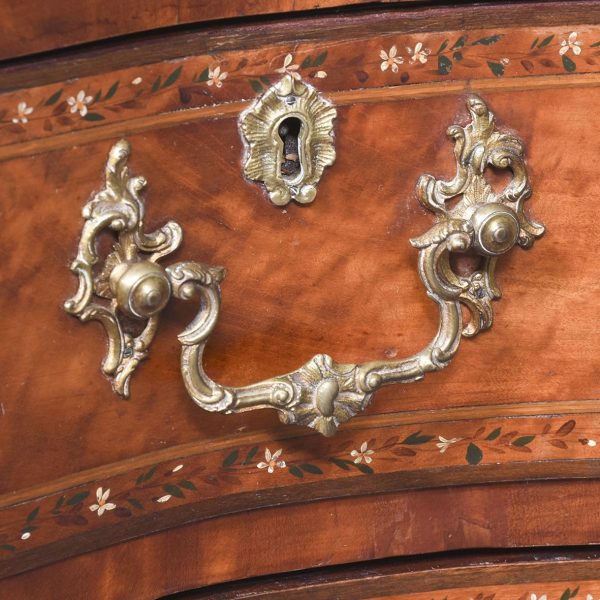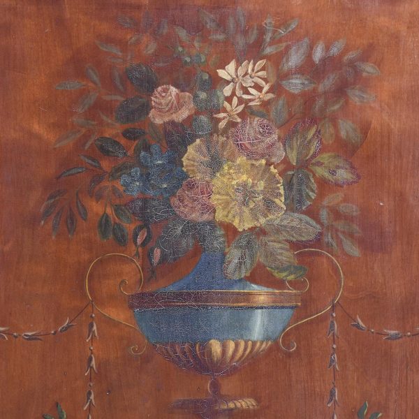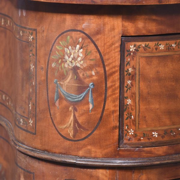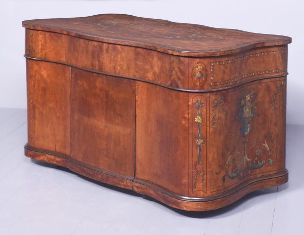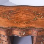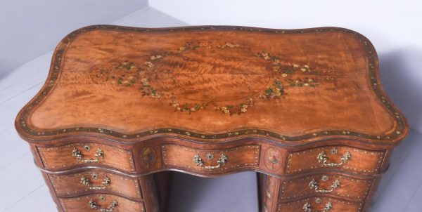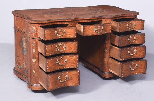Circa 1820. Rare hand-decorated free-standing satinwood knee-hole desk. The shaped top in figured satinwood with hand-painted foliate decoration in a central panel surrounded by peripheral boxwood inlay and foliate decorated rosewood banding. The three shaped-front frieze drawers with original ormolu rococo handles and escutcheons separated by urn-decorated panels. The twin pedestals with three graduated drawers with matching handles and painted decoration with a central back panel. The desk sides decorated with urns and flowers.