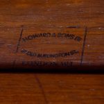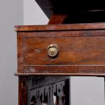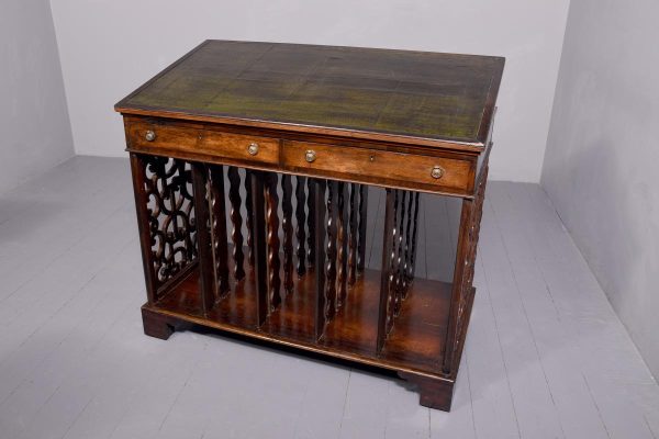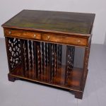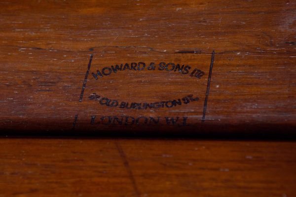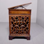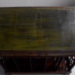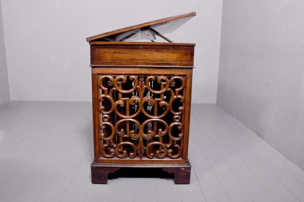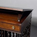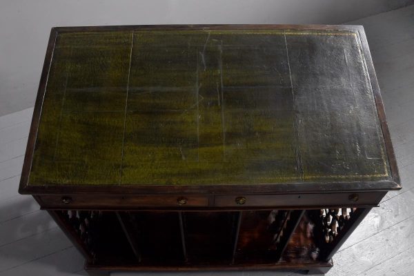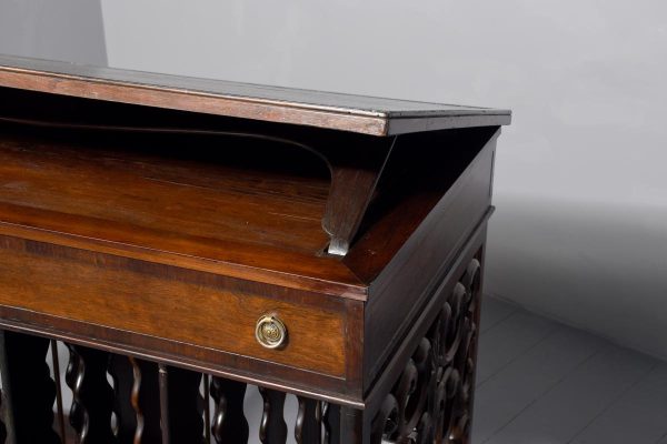 Circa 1870.   A monumental rosewood architects’ desk by ‘Howard & Sons London’, the top with an insert gilded and tooled leather and a stylish fore-edge, the hinged top with three gilded hinges, opens, and is adjustable with a ratchet beneath, the polished surface stenciled “Howard and Sons of London”.  The frieze with a pair of full-length drawers, with faux drawers on the back, with profusely carved gables with foliate carving and scrolling sections, in the Chinoiserie style, with five divisions separated by wavy uprights, with a simple moulding, all resting on four stout bracket feet.