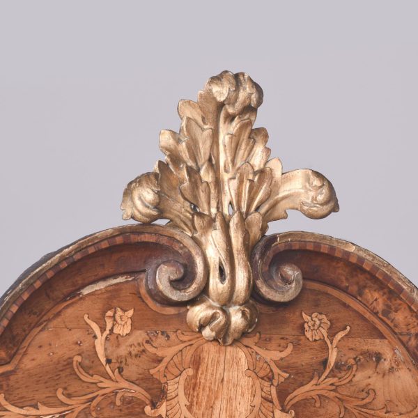 Circa 1790. Rare marquetry- inlaid 18th century Italian walnut bureau cabinet. Surmounted by a giltwood foliate carvings over a foliate inlaid arched frieze, the inlaid bookcase doors opening to shelves and supported on marquetry inlaid feet. The bureau with matching inlaid flap opening to fitted interior over three drawers and bracket feet. Wonderful original colour and patina.