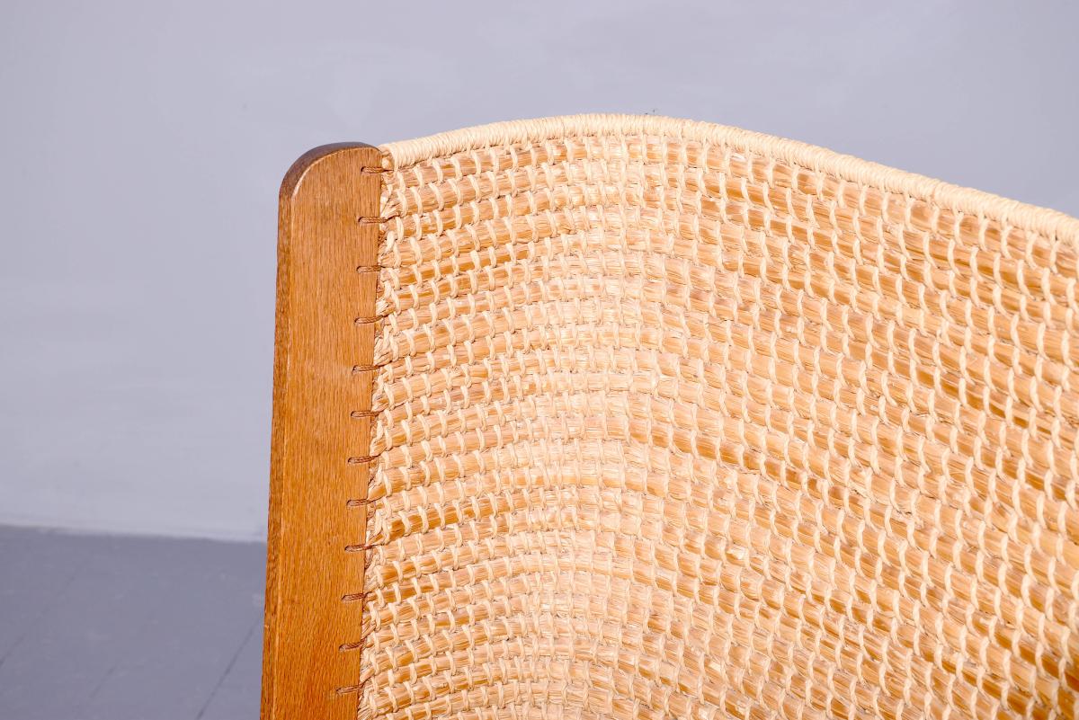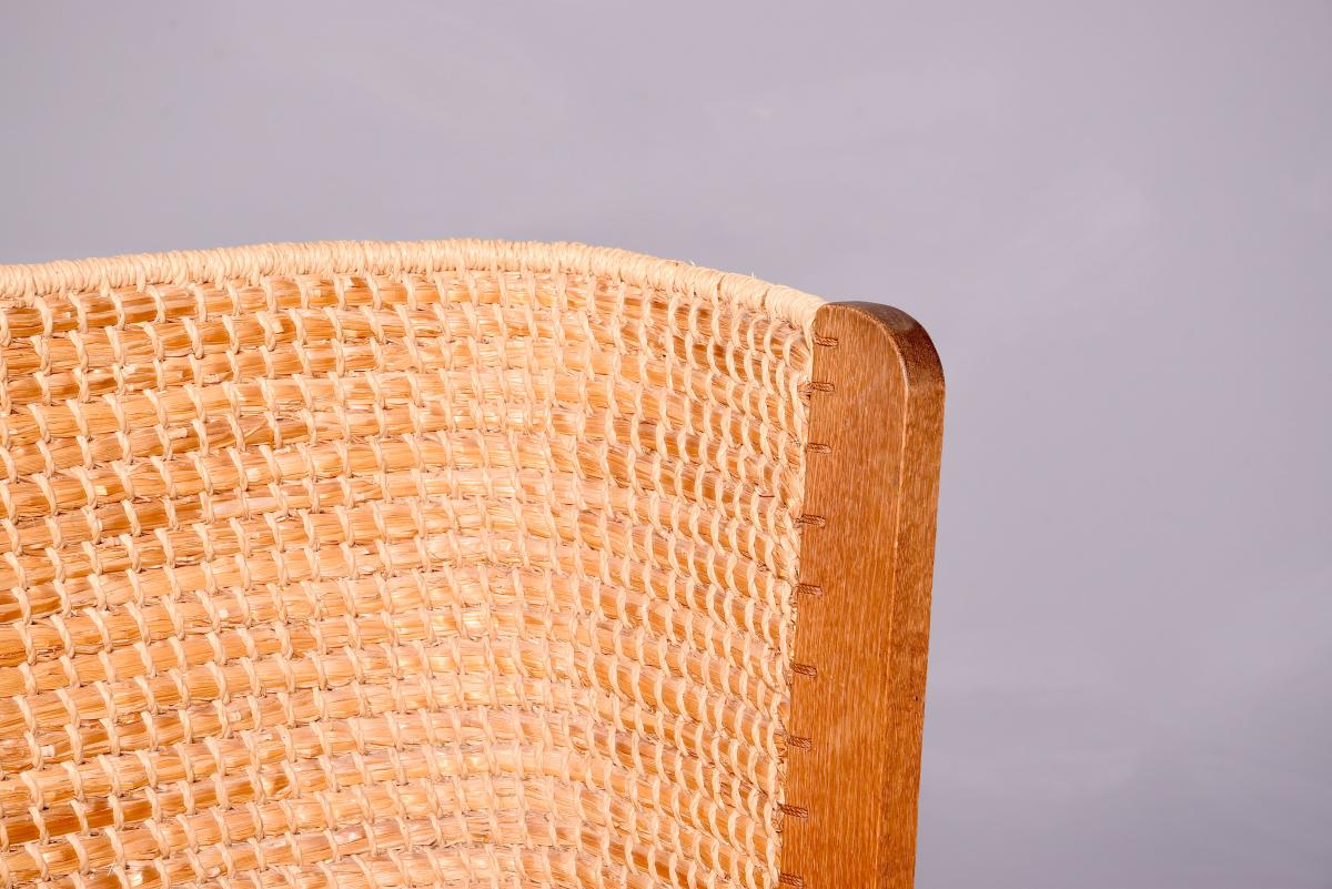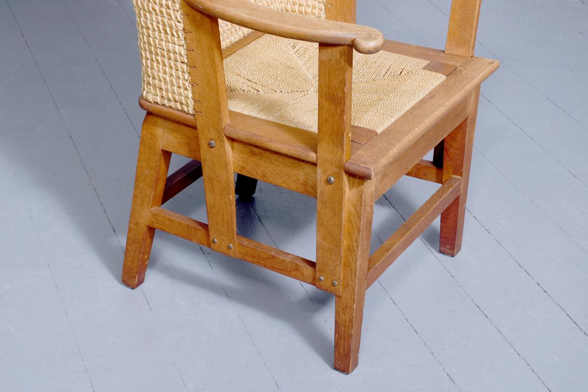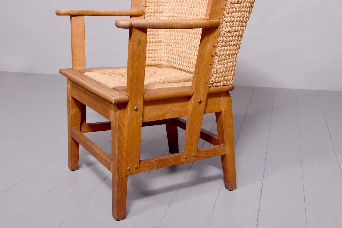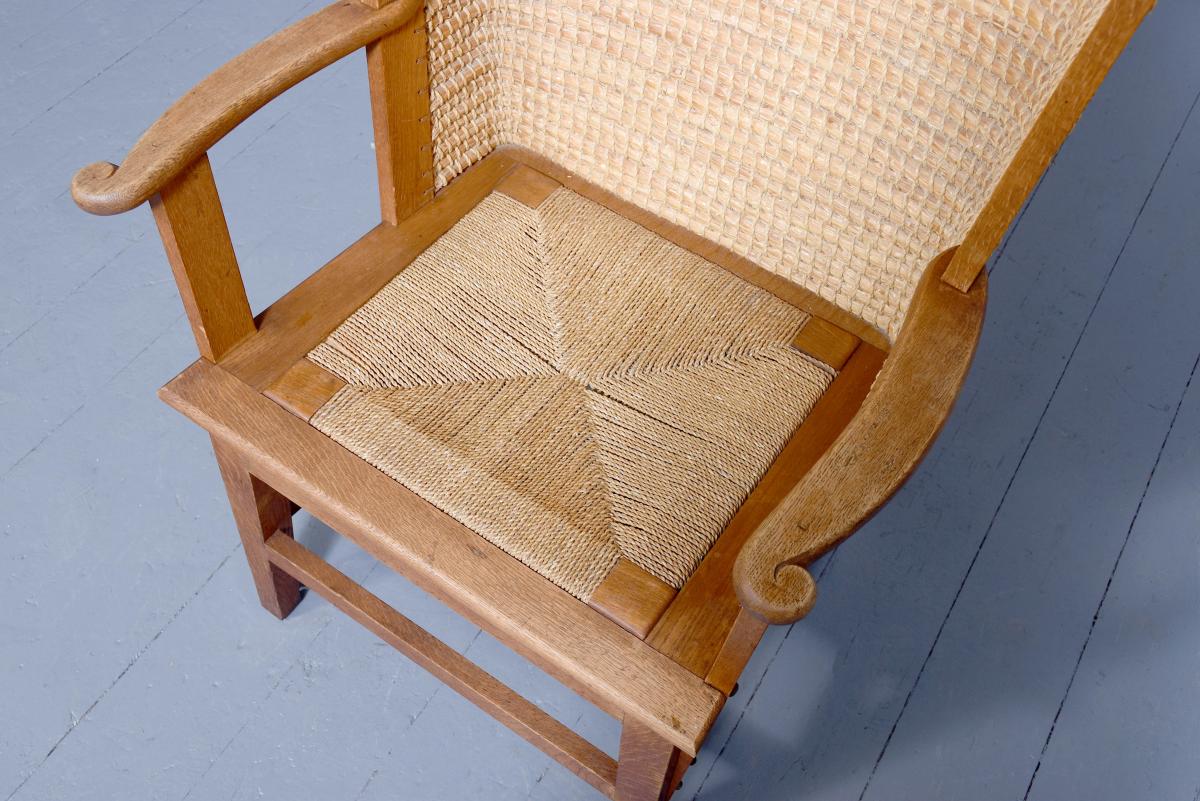 Circa 1960. Rare, outsized mahogany framed Orkney chair in perfect condition. Handmade in Orkney with classically woven oaten straw and marram grass bindings, with a lift out rattan seat. The arms with the classic Kirkness scrolled ends all on square supports with stretchers