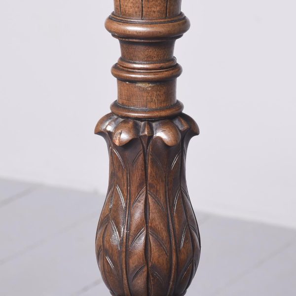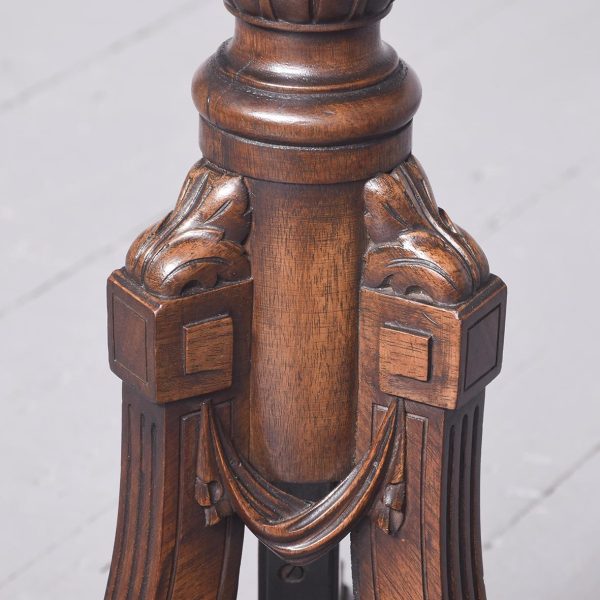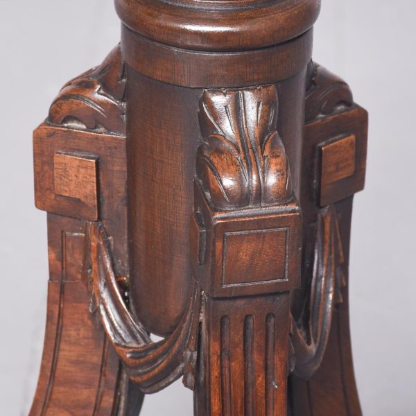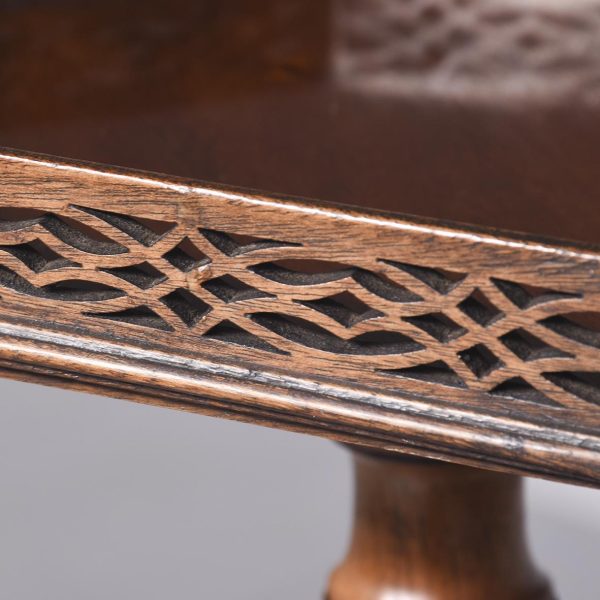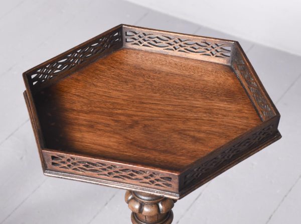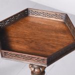 Circa 1890. Rare pair of 19th century, Georgian, Adam-style mahogany wine or tables (with adaptions). The hexagonal shaped tops lovely figured mahogany with open fret galleries above turned stems with fine acanthus carving above fluted cabriole legs with open carved drapes and finishing on a flat toes with oval patera decoration.