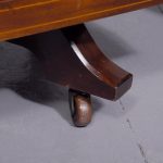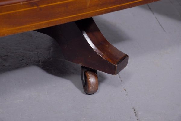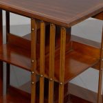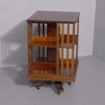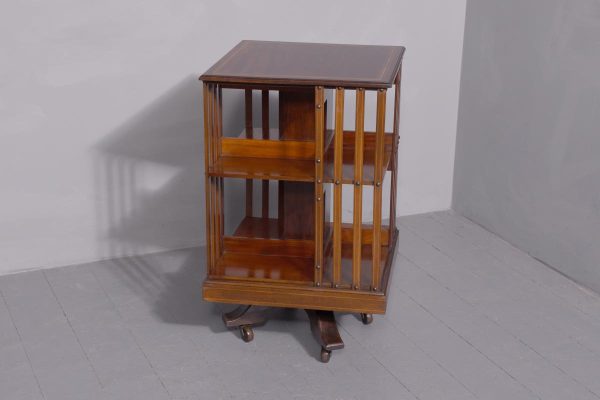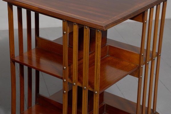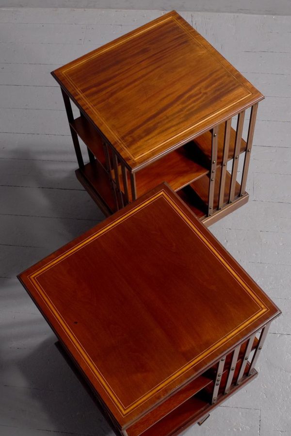 Circa 1900. Rare pair of Edwardian inlaid mahogany Sheraton-style neat size revolving bookcases. The square tops in figured mahogany with boxwood, satinwood and ebony inlay over two tiers of bookcases each with four sections with boxwood inlaid slats. All on a square inlaid base over rotating mechanisms, with four cabriole legs and original brass and brown porcelain castors. In excellent condition