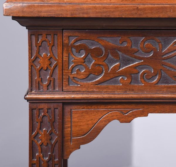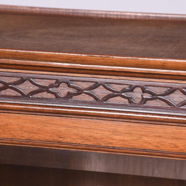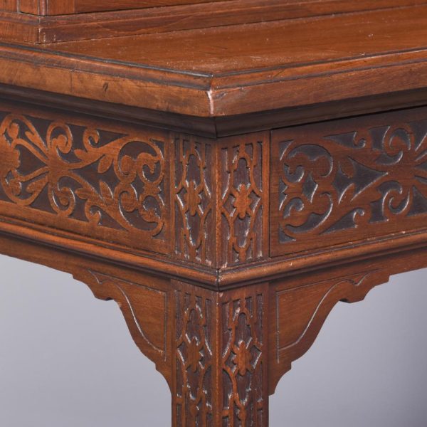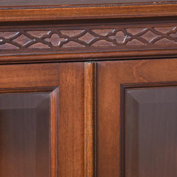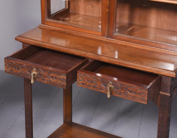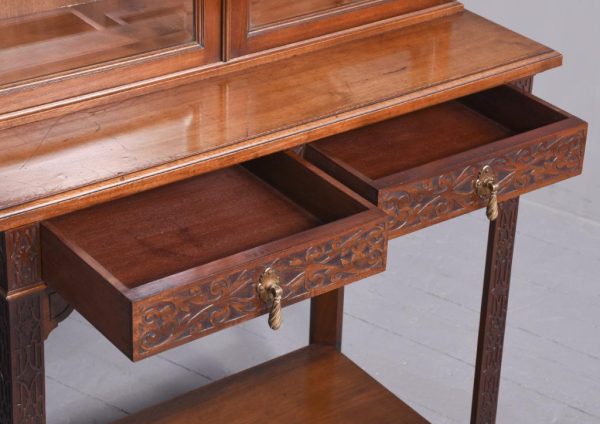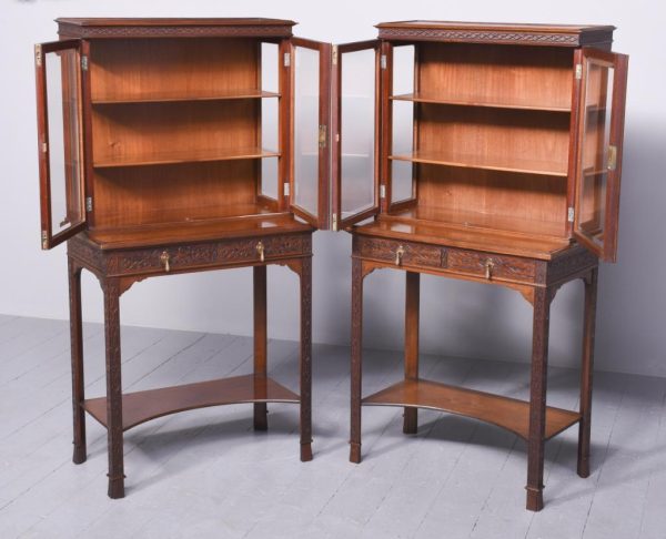 Circa 1880. Rare pair of neoclassical-style mahogany cabinets on stands by famous cabinet makers C Hindley & Sons, Oxford Street, London. Surmounted by a pair of glazed cabinets with polished tops and moulded edges above blind fretwork friezes and twin bevel glass doors, opening to shelved interiors. The table bases with matching blind fretwork on twin mahogany-lined drawers with original brass twisted-drop handles and supported on chamfered legs with matching neoclassical blind fret and shaped under stretchers. All in excellent condition.