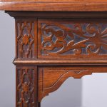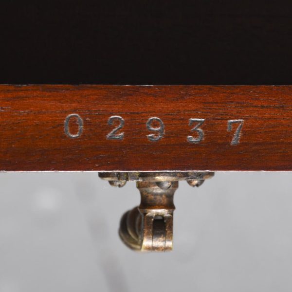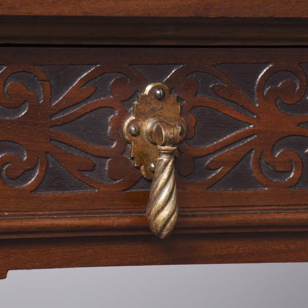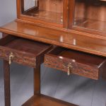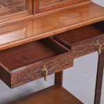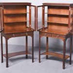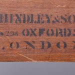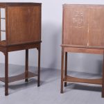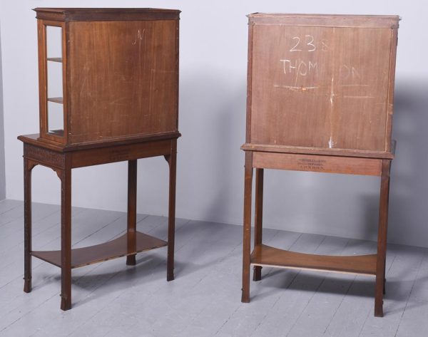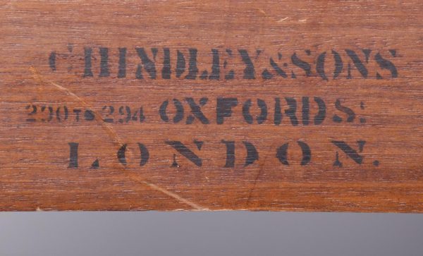 C Hindley & Sons, 134 Oxford Street, London is stamped on the backs of both bases with one drawer imprinted with number 02937. Charles Hindley and Sons were pre-eminent furniture designers, cabinet-makers and decorators who operated from Oxford Street from 1844 to 1892 and supplied furnishings and decorations to many famous buildings and clients including for Buckingham Palace, The Duke of Argyll and the Duke of Newcastle. These cabinets possibly designed by J. Armstrong Stenhouse one of Hindley and Sons’s notable designers.