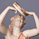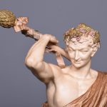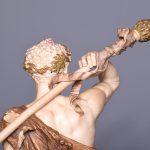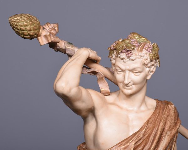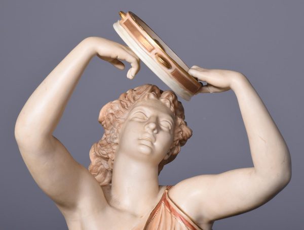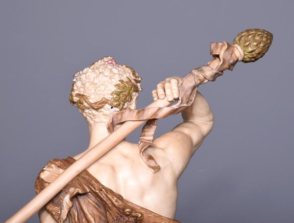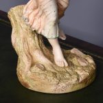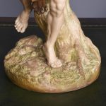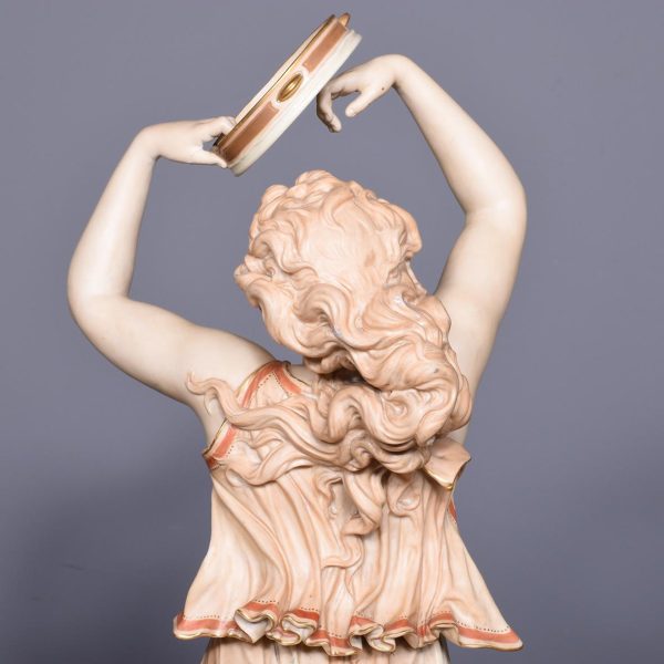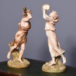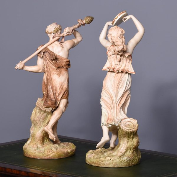 Circa 1900. Rare pair of very large Royal Worcester figures mounted on circular rustic bases. A neo classical female figure playing the tambourine whilst a male with draped clothes is carrying a torch. Minor finger repair to female figure.