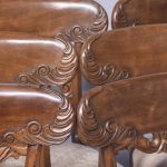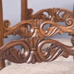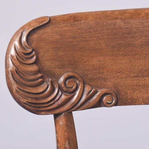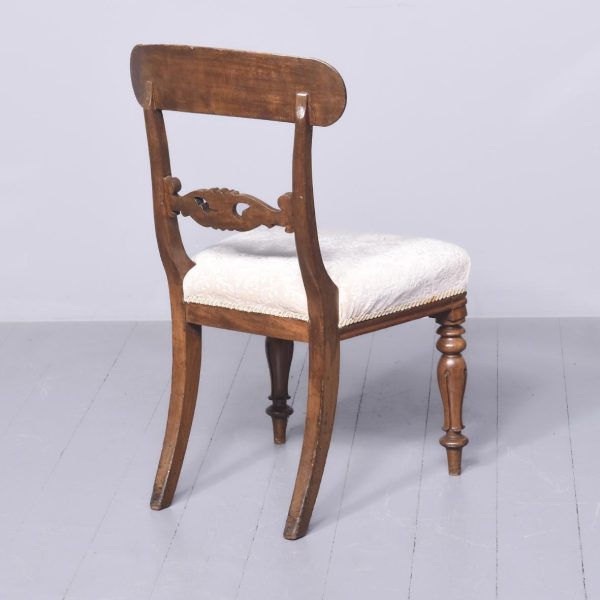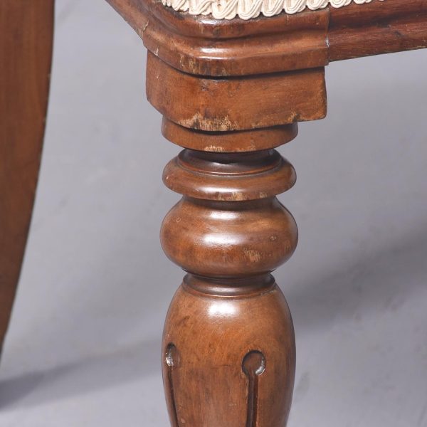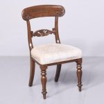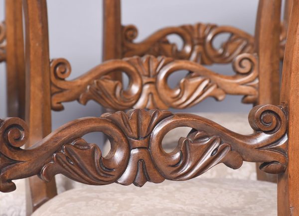 Circa 1820. Rare set of 12 outstanding quality Regency mahogany dining chairs in excellent condition. The acanthus-carved curved top rails above open carved lower rails with acanthus and scrolling decoration supported on chamfered curved uprights. The over-stuffed seats in traditional horse-hair upholstery and patterned velvet covering in excellent condition above reeded seat rails and ring-turned fluted legs in front and outswept rear supports.
