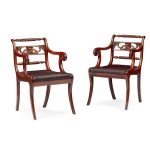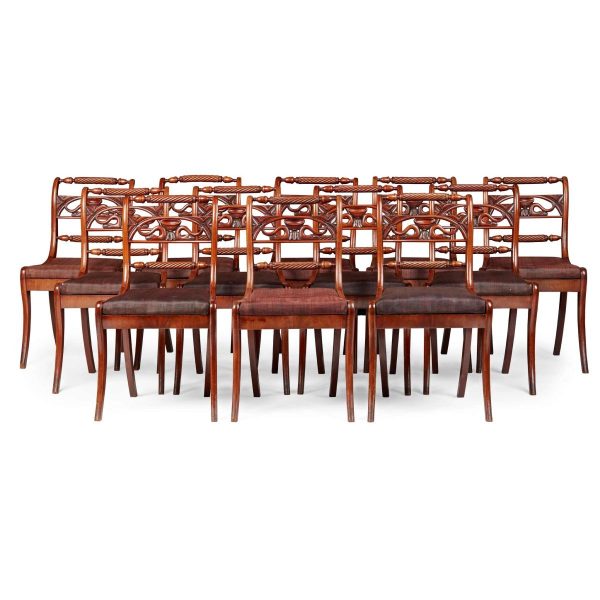 Circa 1815. A quality set of 14 Regency mahogany dining chairs. The set consisting of 12 side chairs and a pair of armchairs, the elegant backs with a spiral carved top and bottom rails with a pierced back with elegant carving including mythical snakes, drop in seat pads covered in horse hair, raised on saber legs and with double string inlay on the front and out swept legs at the back. Provenance – by family descent, from Sir James Young Simpson, the eminent 19th century physician.
