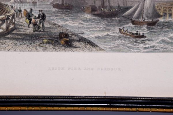 Circa 1850. Rare set of 6 hand-tinted engravings of Leith and its Harbour. The engravings depict the new Town Hall, Customs House, Exchange Building, Signal House, Leith Pier and Harbour. The original paintings by Thomas Shepherd later Engraved byJ Henshall, T Higham, & R Wallis. All mounted in ebonised and gilded frames. All in excellent condition.