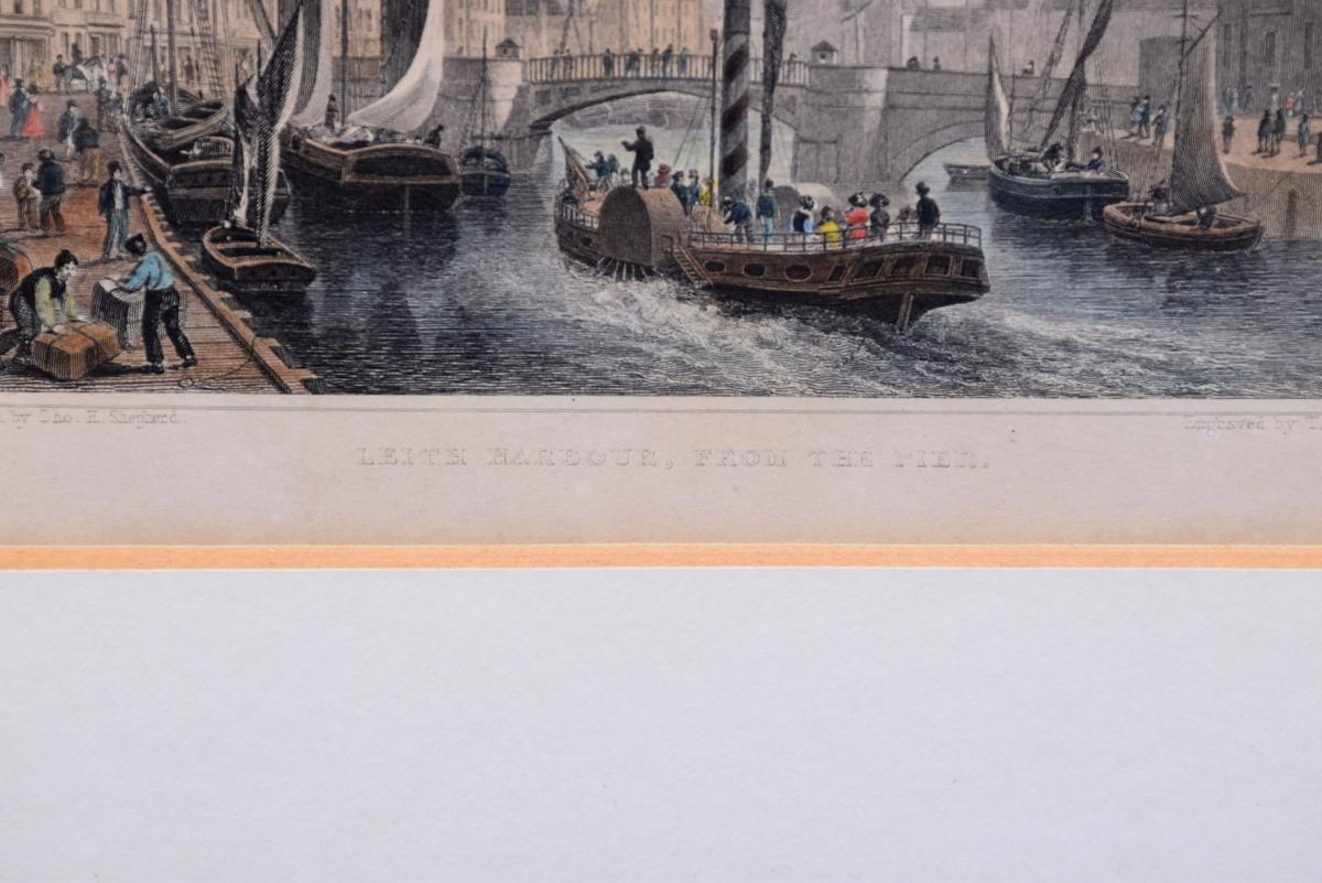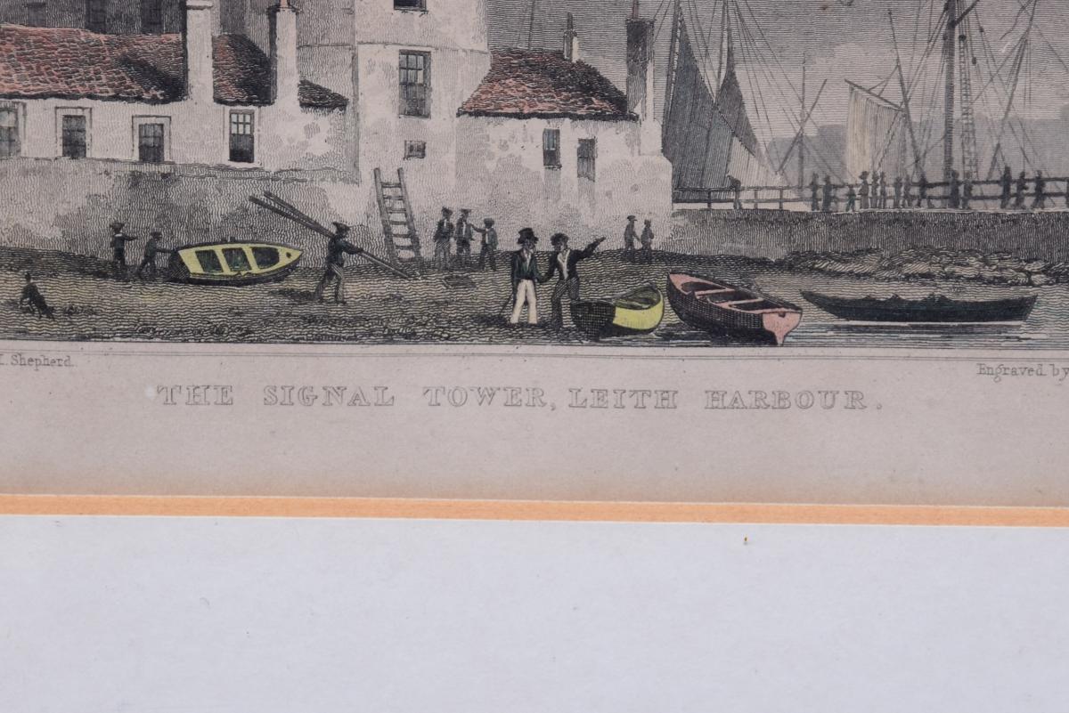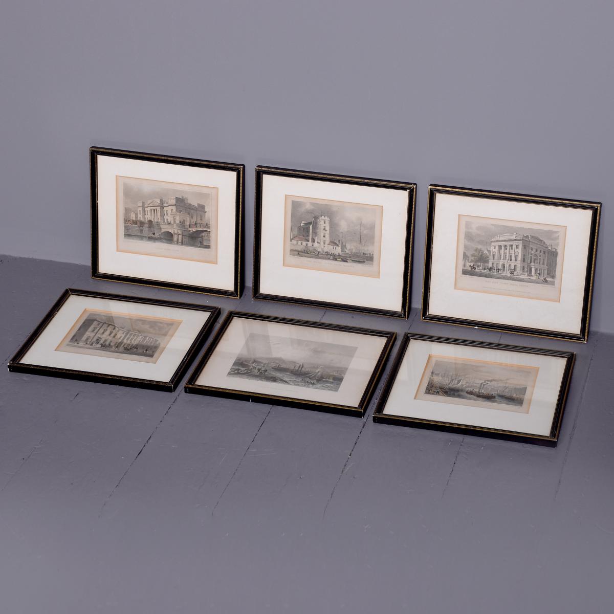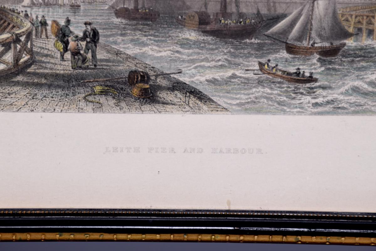 Circa 1850. Rare set of 6 hand-tinted engravings of Leith and its Harbour. The engravings depict the new Town Hall, Customs House, Exchange Building, Signal House, Leith Pier and Harbour. The original paintings by Thomas Shepherd later Engraved byJ Henshall, T Higham, & R Wallis. All mounted in ebonised and gilded frames. All in excellent condition.