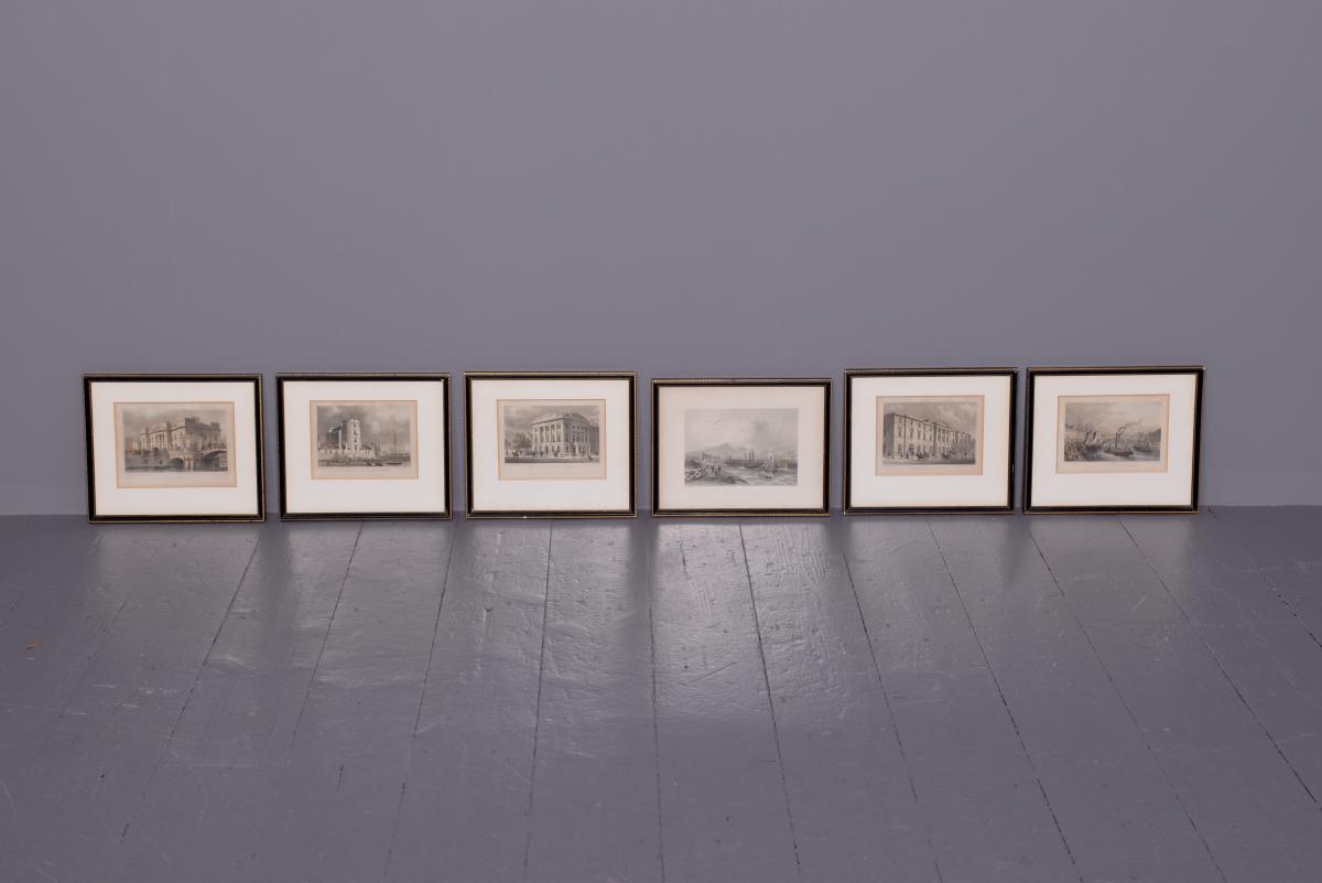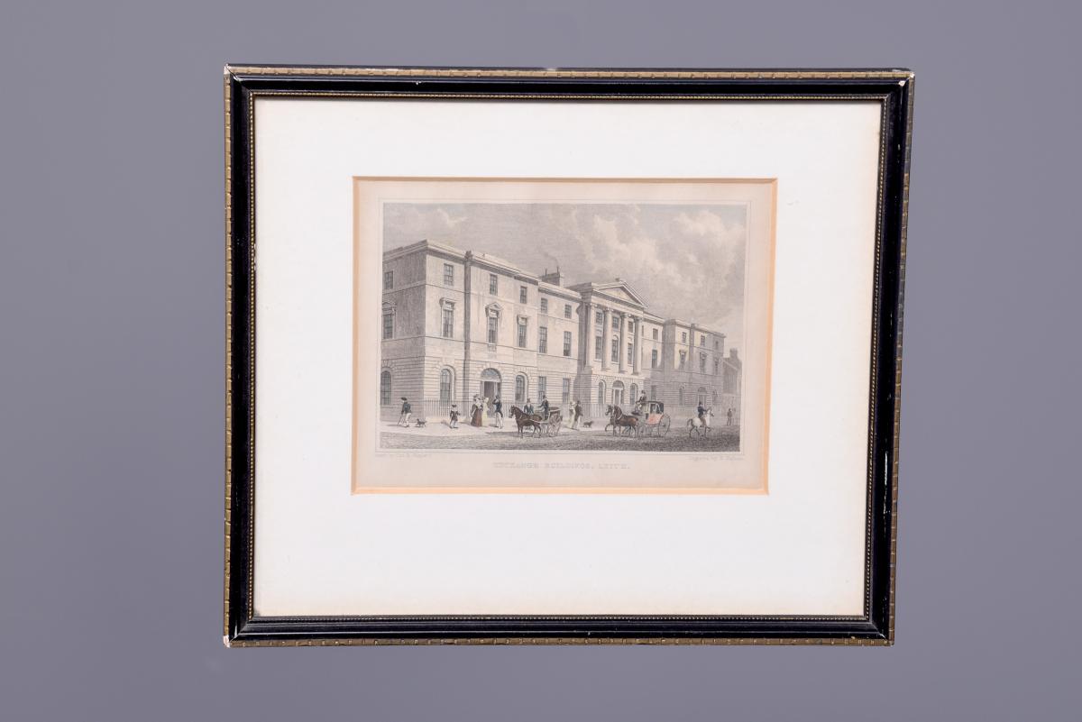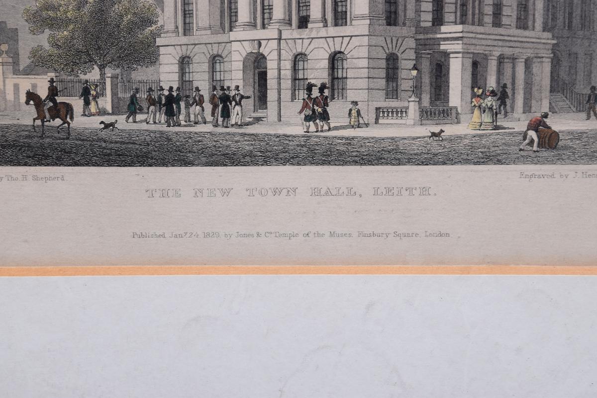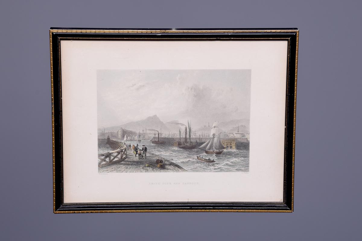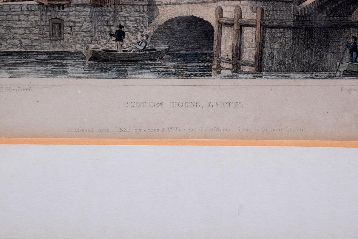 Circa 1850. Rare set of 6 hand-tinted engravings of Leith and its Harbour. The engravings depict the new Town Hall, Customs House, Exchange Building, Signal House, Leith Pier and Harbour. The original paintings by Thomas Shepherd later Engraved byJ Henshall, T Higham, & R Wallis. All mounted in ebonised and gilded frames. All in excellent condition.