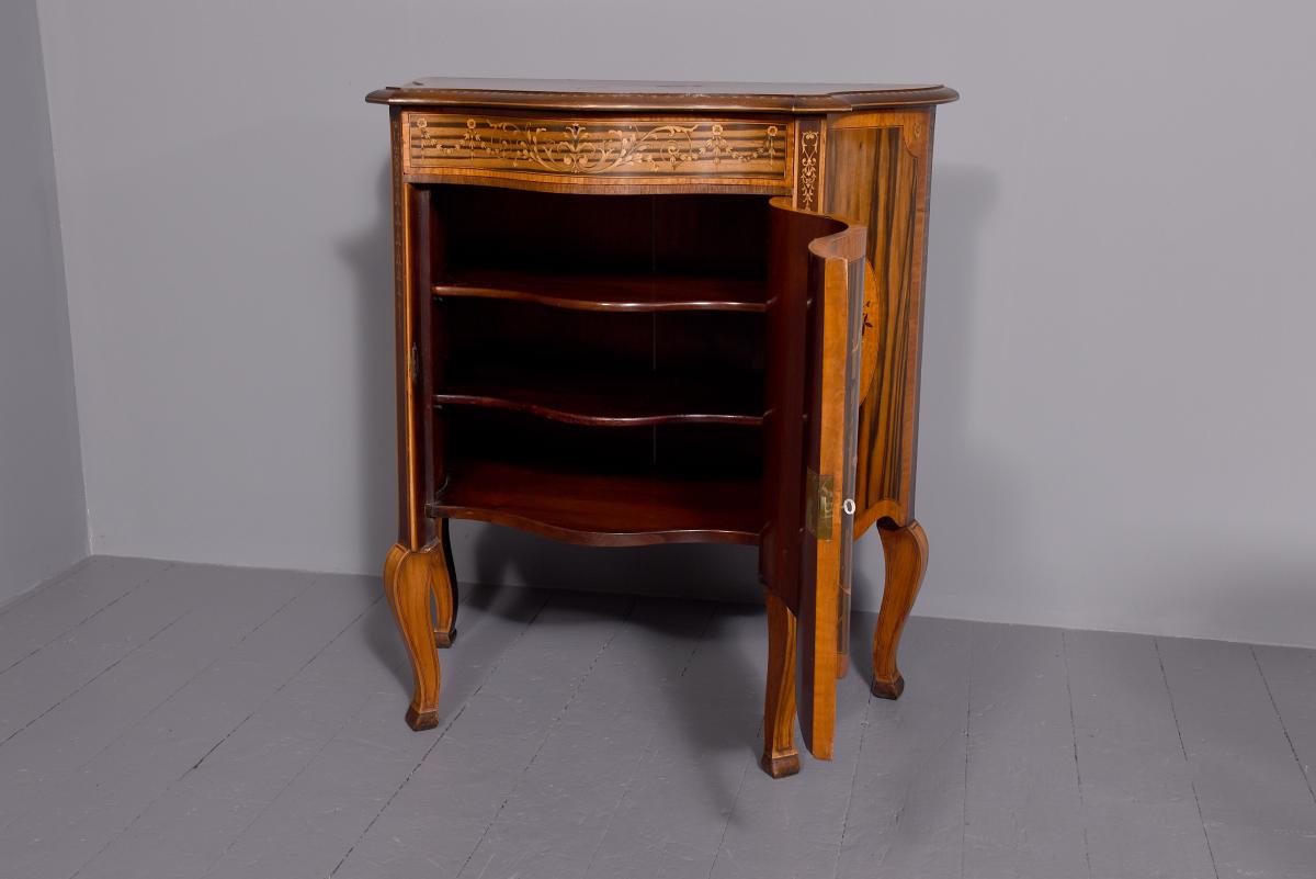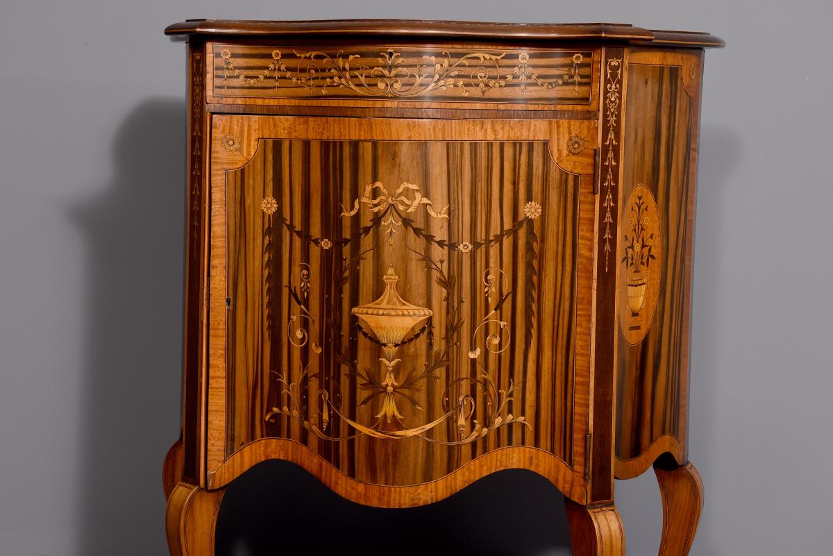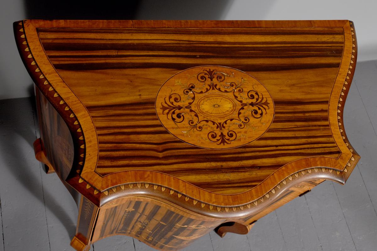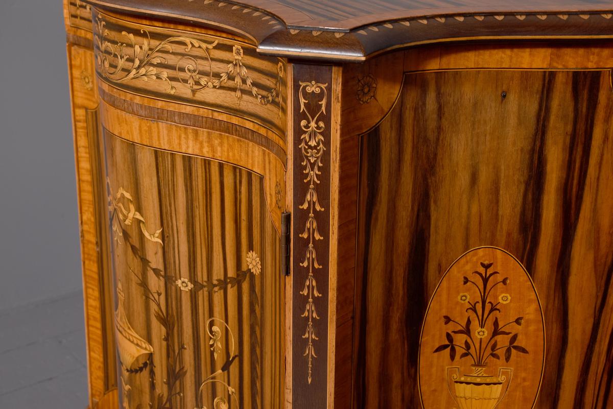 Circa 1880. Rare Sheraton-style inlaid zebrawood (Zebrano) side cabinet. The serpentine-shaped top with a central panel with exquisite foliate and shell inlay in other exotic woods, and with a satinwood, boxwood, and ebony banded fore-edge above a moulded inlaid front. The frieze with bell flower chains and acanthus decoration above a door with inlaid urn, ribbon bows, and bellflower chains. The sides with further inlaid panels, with inlaid canted corners above shaped inlaid legs. Exquisite piece in excellent condition.