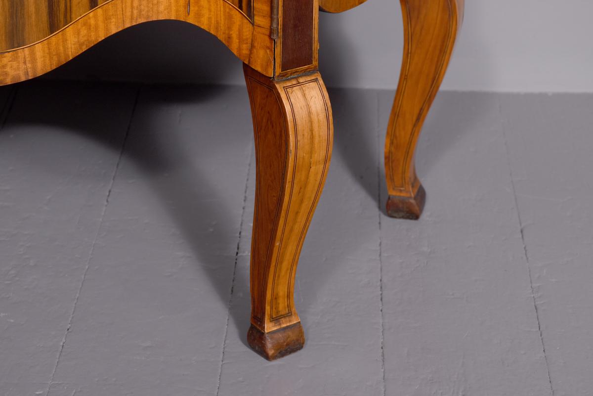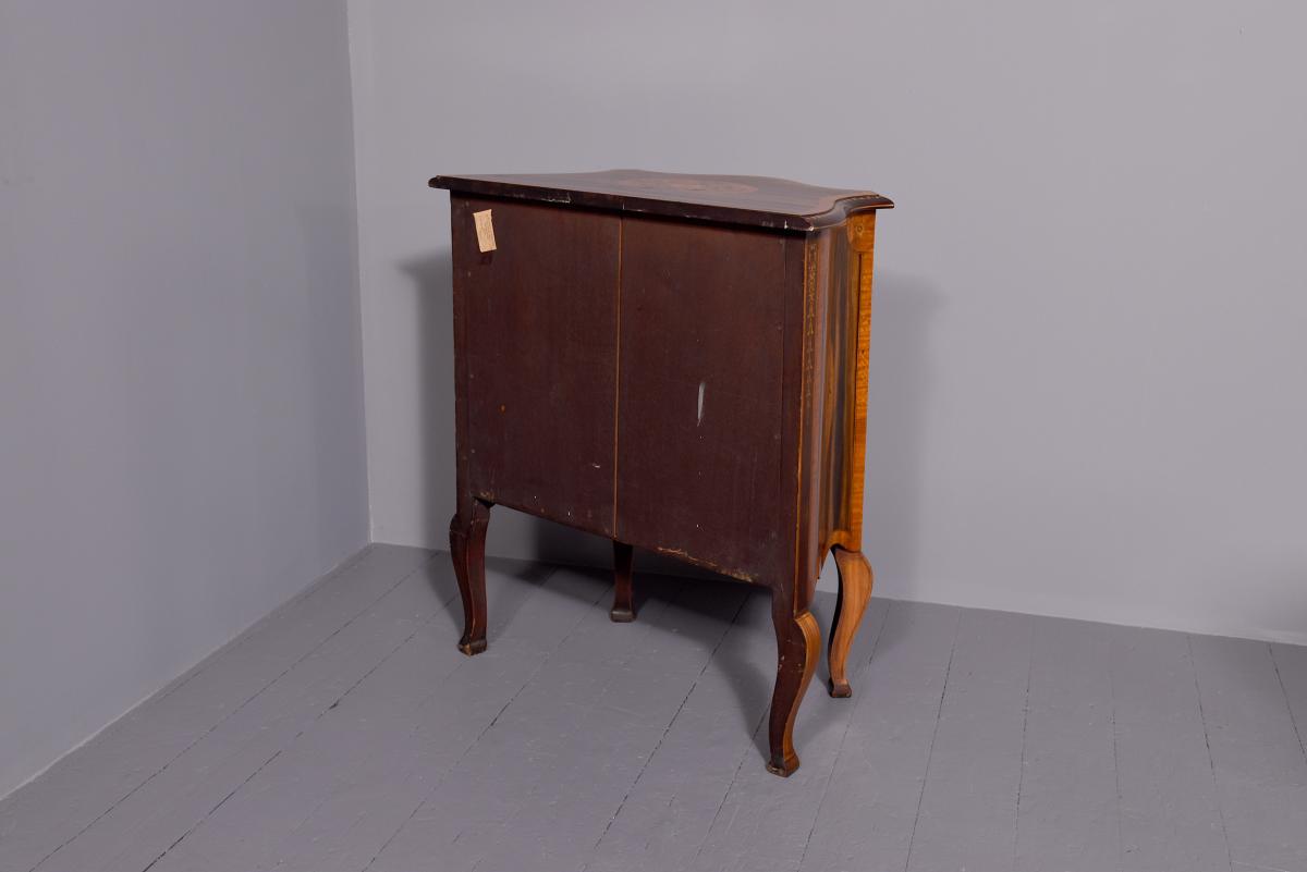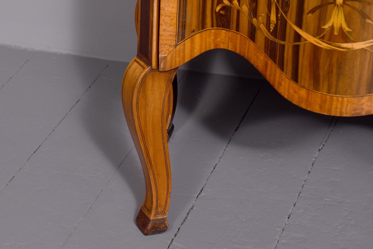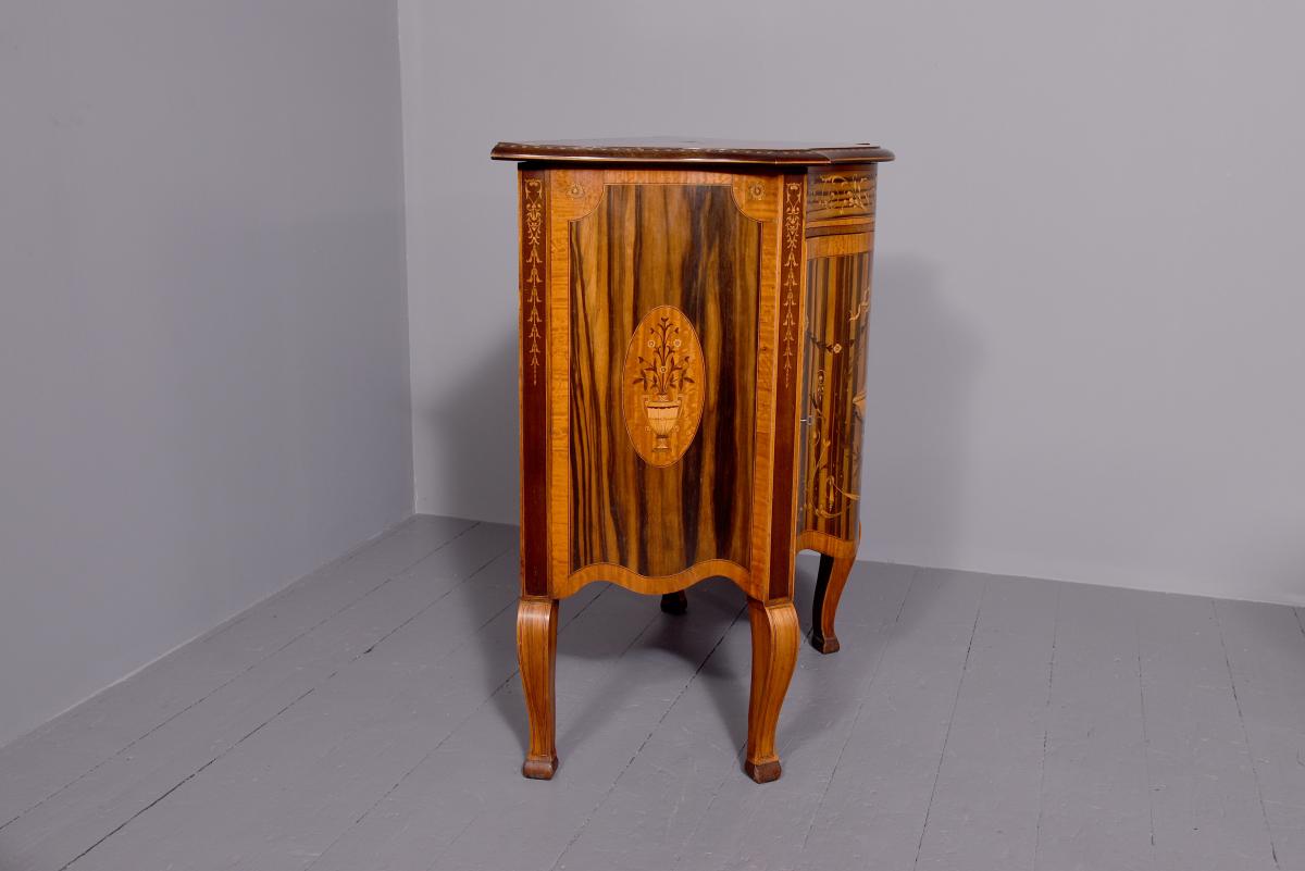 Circa 1880. Rare Sheraton-style inlaid zebrawood (Zebrano) side cabinet. The serpentine-shaped top with a central panel with exquisite foliate and shell inlay in other exotic woods, and with a satinwood, boxwood, and ebony banded fore-edge above a moulded inlaid front. The frieze with bell flower chains and acanthus decoration above a door with inlaid urn, ribbon bows, and bellflower chains. The sides with further inlaid panels, with inlaid canted corners above shaped inlaid legs. Exquisite piece in excellent condition.