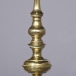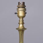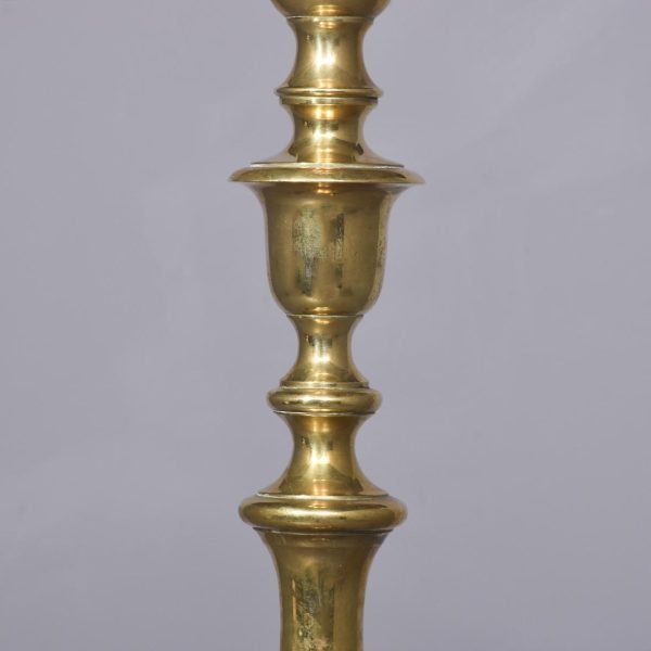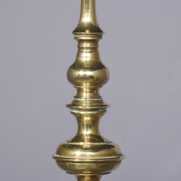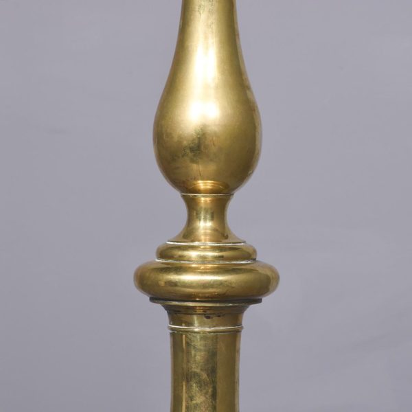 Circa 1880. Rare, solid brass full-sized Victorian standard lamp. The central turned column with ring and bulbous decorations over a base with four scrolled heavy brass feet on circular pods. In excellent condition.