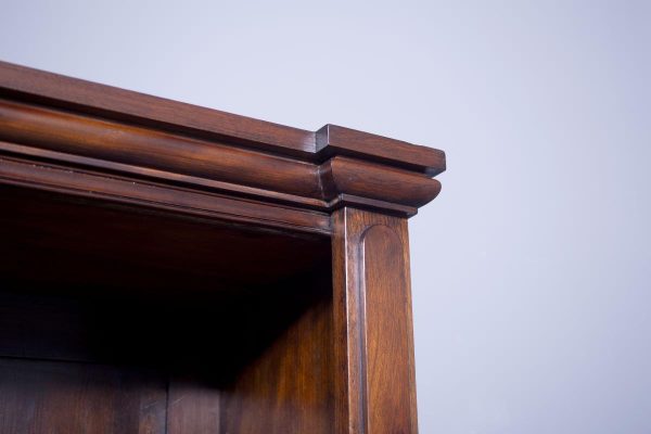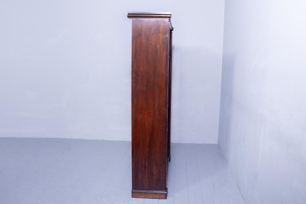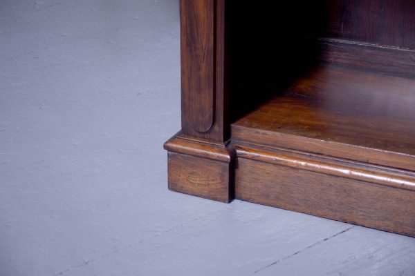 Circa 1840.Rare Solid Rosewood Early Victorian Tall Open Bookcase. Surmounted by a reverse breakfront, moulded cornice, the open bookcase with four adjustable shelves flanked by moulded pilasters and with a panelled faux-rosewood back, supported on a moulded reverse breakfront base. In excellent condition, functional and attractive.