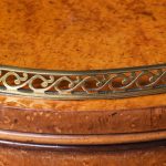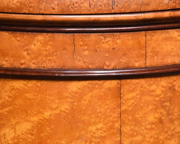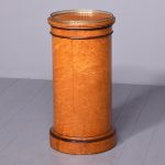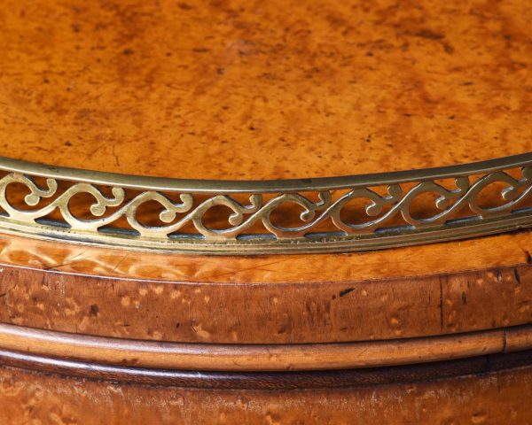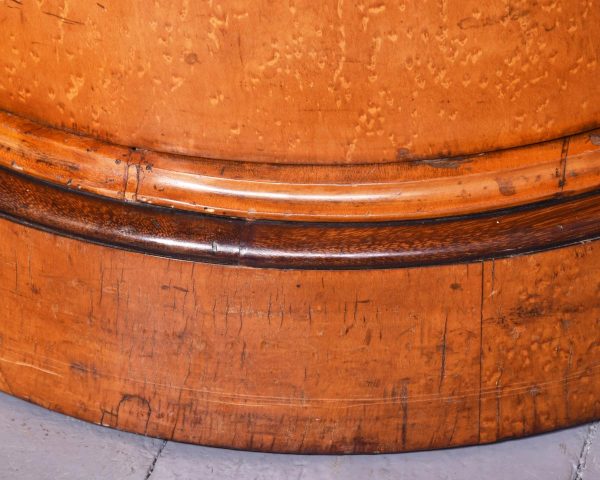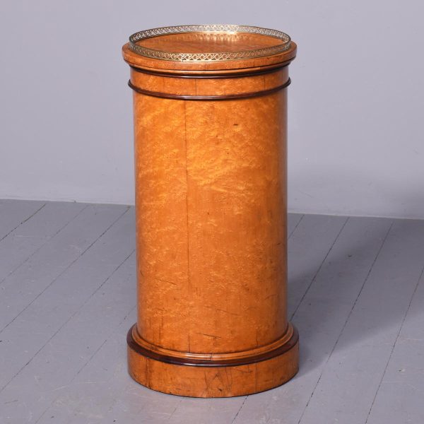 Circa 1870. Rare Victorian birdseye maple cylindrical lampstand or side cabinet. The circular top with an open fret cast brass gallery and beaded frieze over cylindrical body with door opening to a shelved interior. All supported on an enclosed plinth base. Would make an excellent lamp stand.