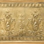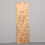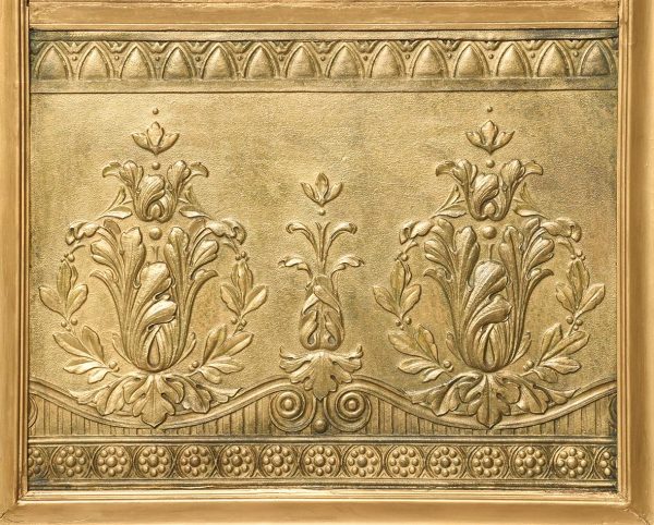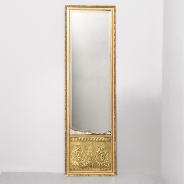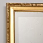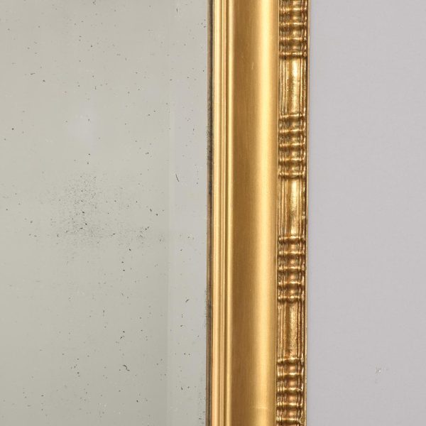 Circa 1900. An unusual gilt frame bevel edge mirror. The moulded frame with an interesting pattern on the fore-edge, concave moulded section contains the mirror which has interesting foxing towards the bottom. There is a further panel in the base which is gilded and embossed paper, perhaps anaglypta or embossed leather.
