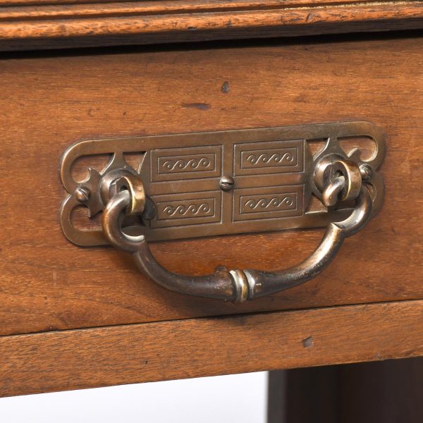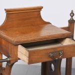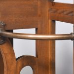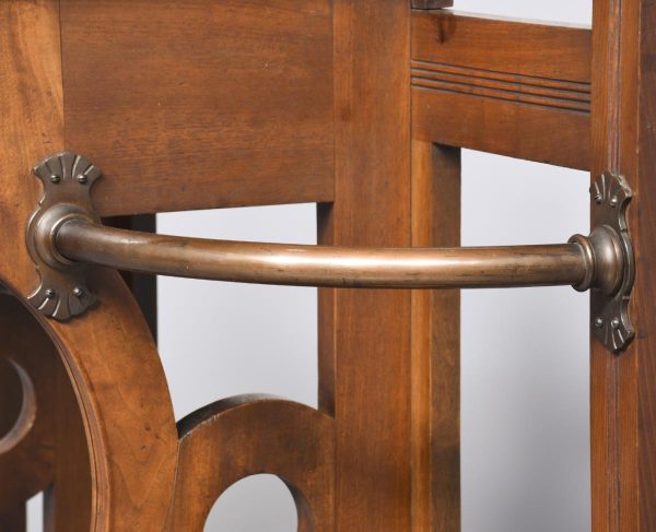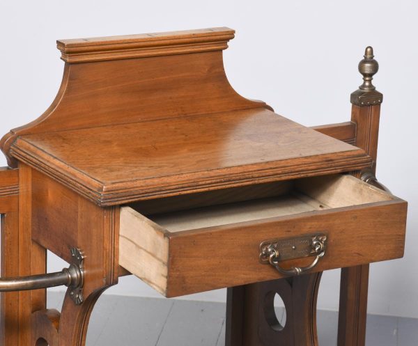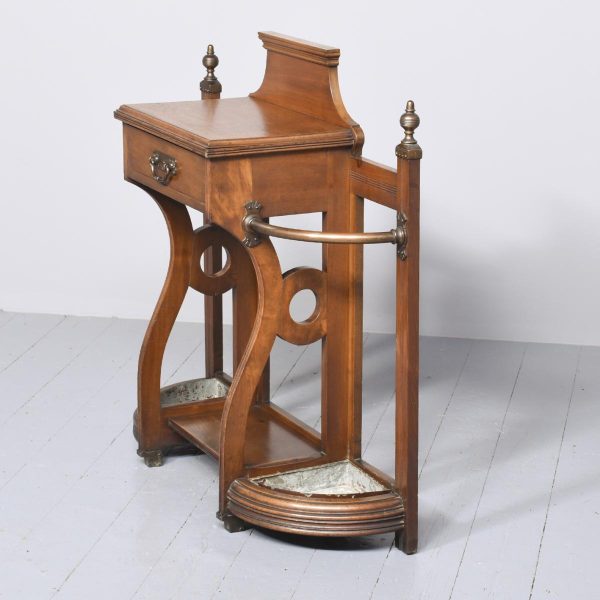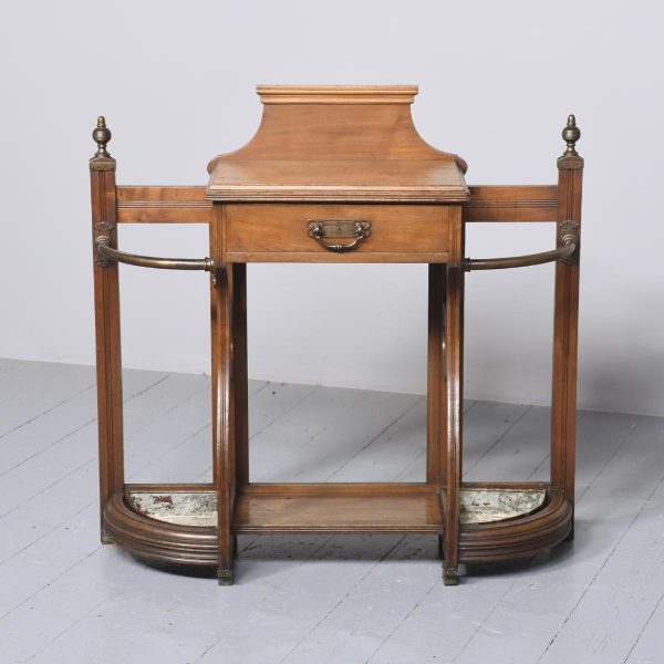 Circa 1890. An interesting red walnut stick stand in the manner of James Shoolbred of London. The stylish back with flat section beneath, two curved copper sections for retaining the sticks, held on a ribbed uprights which are surmounted by stylish copper urns. In the center there is a full-length drawer with Victorian date kitemark stamped on it. The drawer retains its original oxidized copper handle with pierced and engraved back plate. The facings are all ribbed, In the center there is a small shelf, and the whole piece rests on cast brass feet.