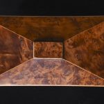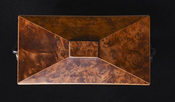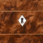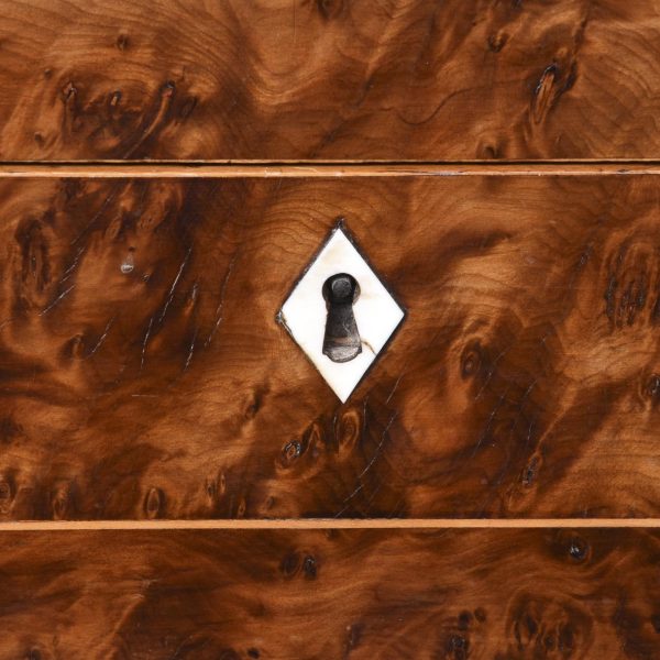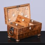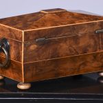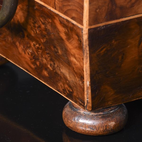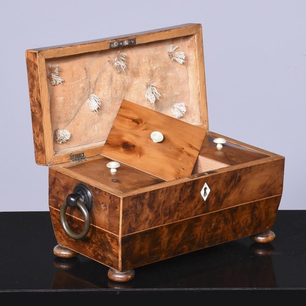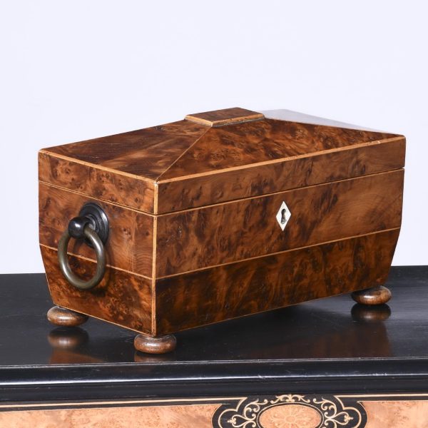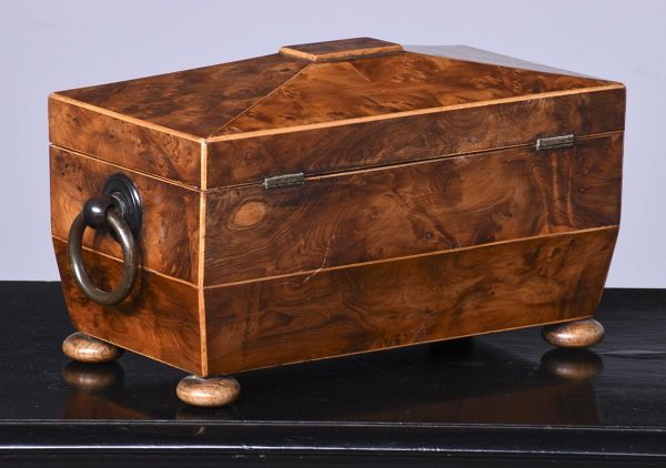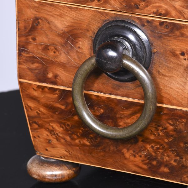 Circa 1810. A Regency burr yew sarcophagus shaped tea caddy of generous proportions with string inlay between the segments on the top and there is a small rectangular section which has got boxwood inlay. Inside the lid there are 3 lidded sections, 1 large one in the centre and 2 smaller ones left and right. The lids are in yew and they have stylish knobs with a ribbed top. The inside of the lid has been covered in fabric. At the front there is a bone diamond shaped escutcheon, a further string inlay, 2 large bronze patination lifting rings at the sides and at the base and the whole piece stands on 4 large squat bun feet.