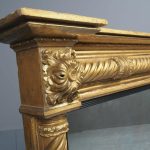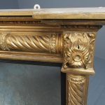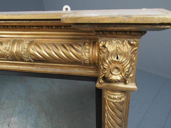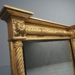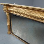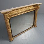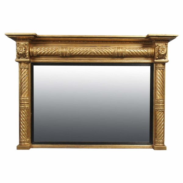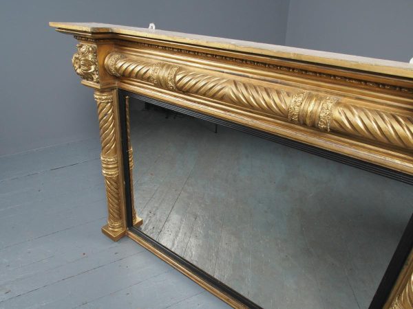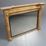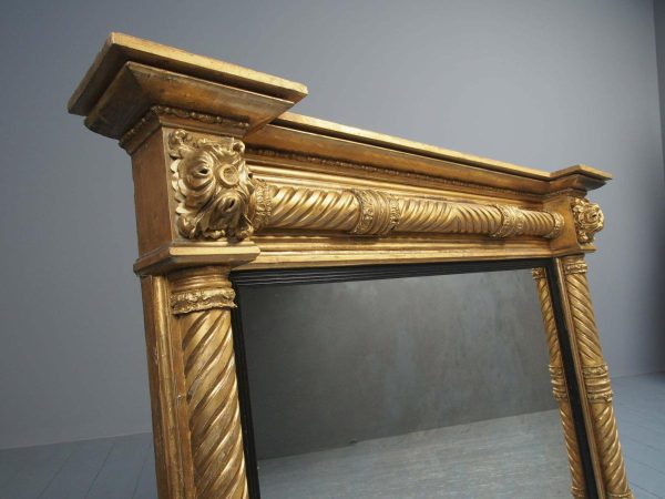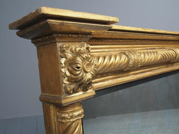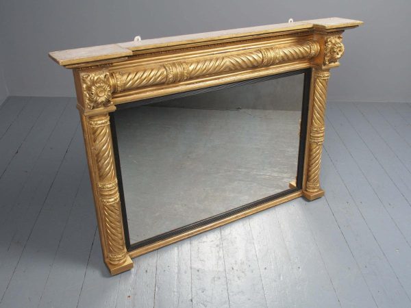 Circa 1820, Regency carved and gilded overmantel mirror. The shaped top with moulding and beading flanked by large carved flowerheads and pilasters with carved capitals over turned columns. Retaining the original mirror plate with ribbed black slip, and with original gilding in good condition.