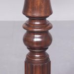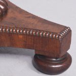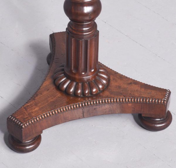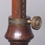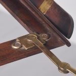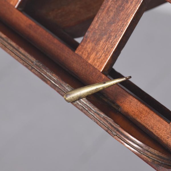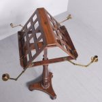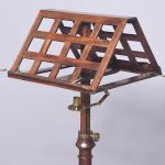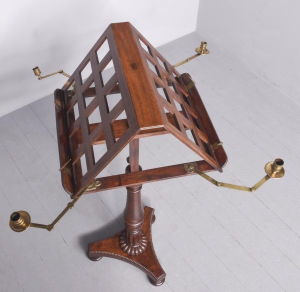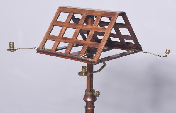 Circa 1815. A rare Regency mahogany adjustable duet stand. The A framed top with its lattice style framing with two mahogany stops which are hinged and have small brass uprights to hold the music in place, it retains its four original adjustable candle sconces which can move in multiple directions, the A frame supported on a rectangular stem with brass apertures in the side for vitiating the heights. All supported on a turned and tapering stem with a turned section in the center fluted towards the base with a dragooned collar, all resting on a concave platform base with fine quarter beadings on the fore-edge resting on four squat bun feet.