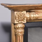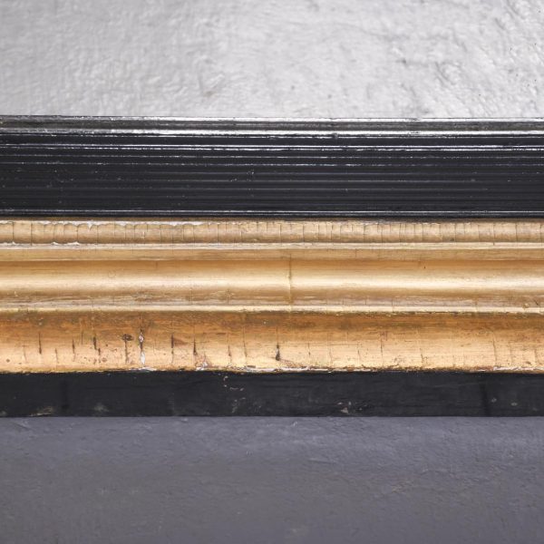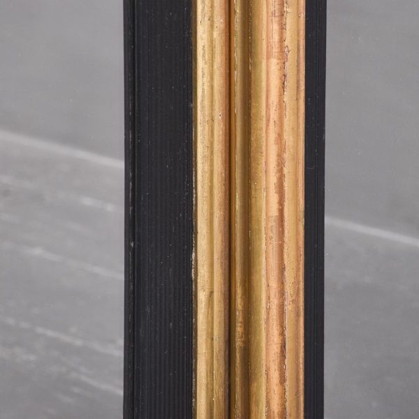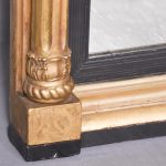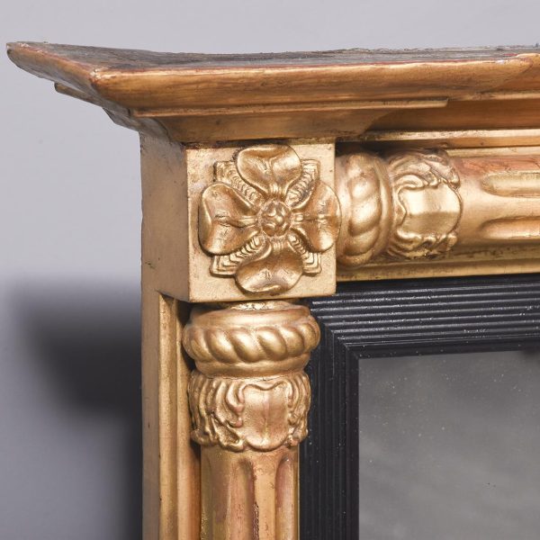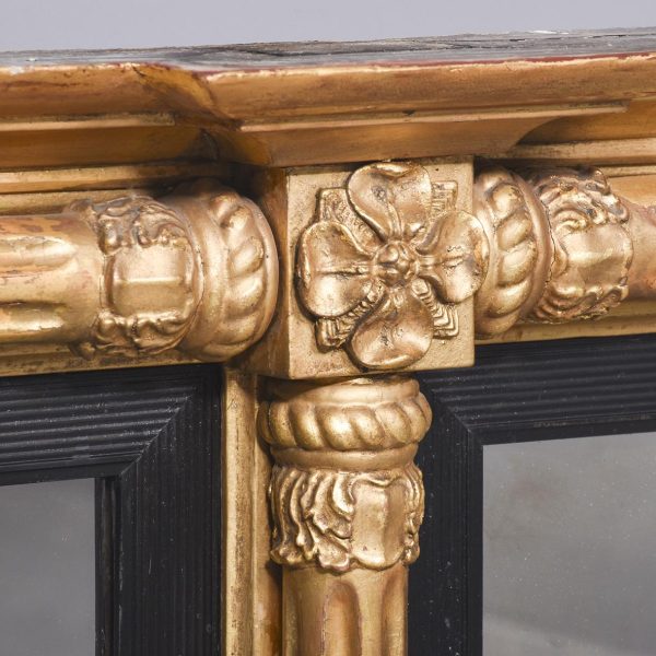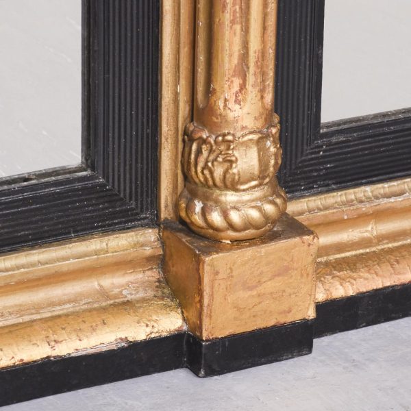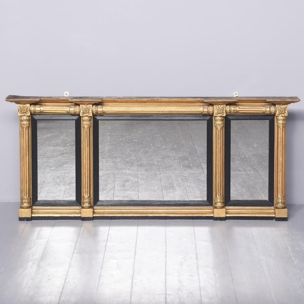 Circa 1815. A quality Regency gilded tryptic mirror. The shaped moulded cornice with a stylish and interesting frieze above fluted columns with carved capitals, the three mirrors contained in an ebonized gilt slip, each flanked by pilasters similar to the top. Beneath the mirrors there is further mouldings including a half round gilded moulding, resting on an ebonized base following the form of the mirror.