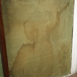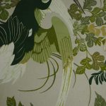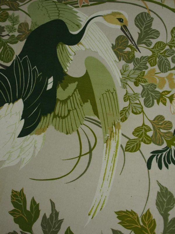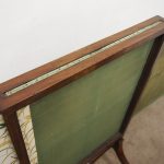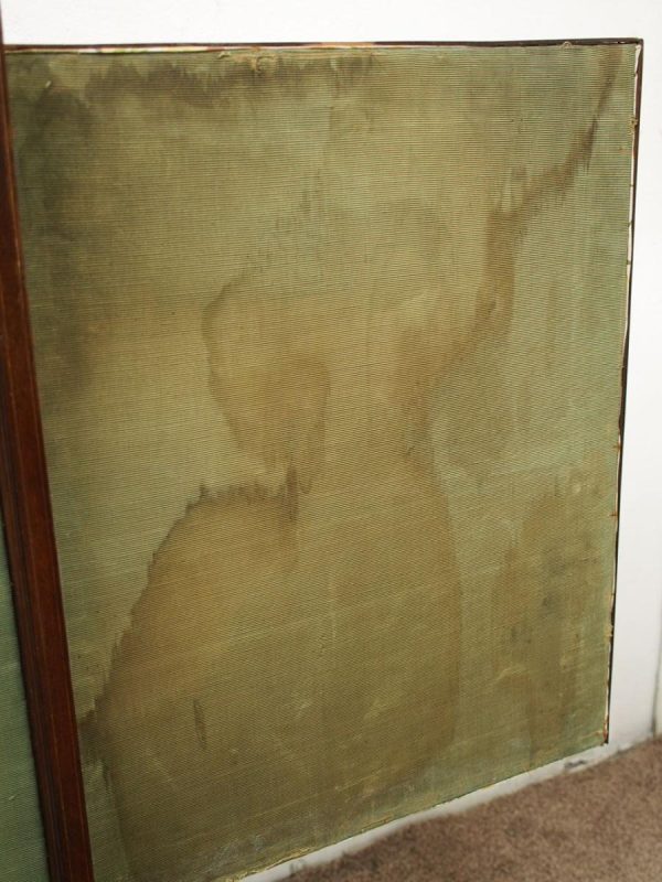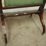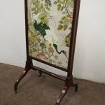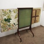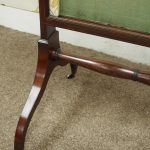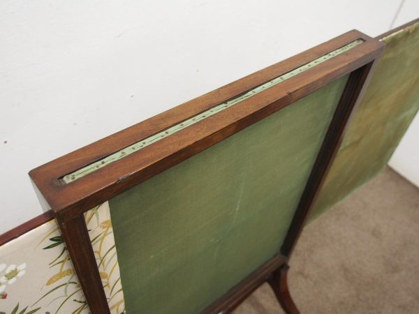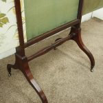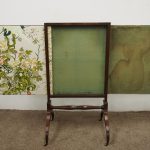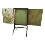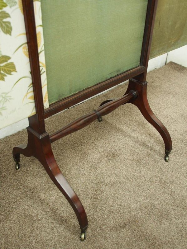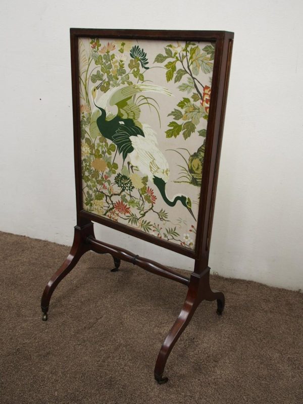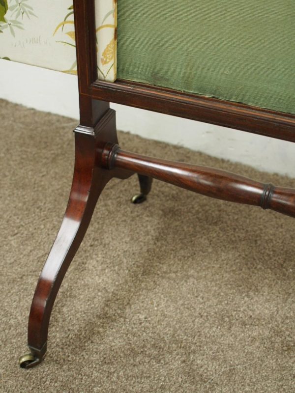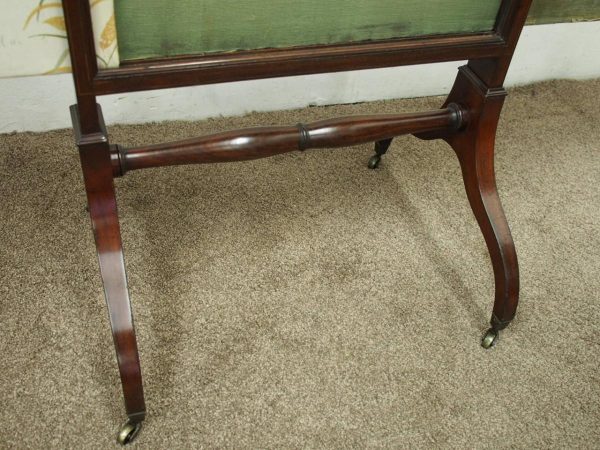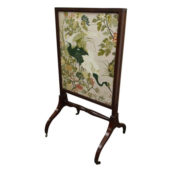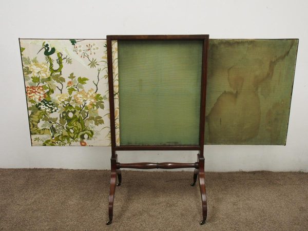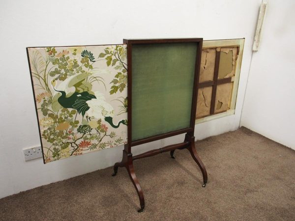 Circa 1810, Regency floor standing, 3 fold, mahogany and crane fabric fire screen. With its rectangular top and aperture in the centre containing one of the screens. There are two further pull out sections on the left and the right containing the other screens, with some staining and backing missing. The frame of the panels has double string inlay in boxwood and a large bulbous cross stretcher for stability. It stands on 4 downward facing sabre legs which finish with a tapering brass cup and brass castors beneath.